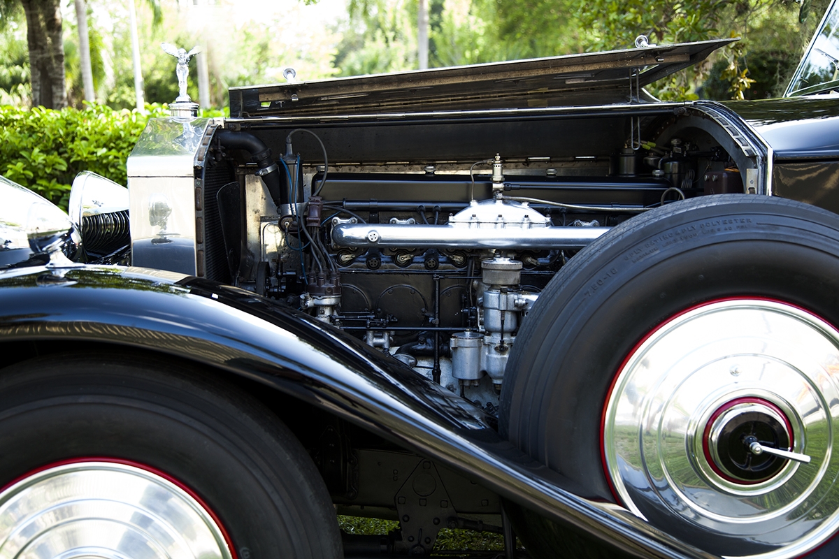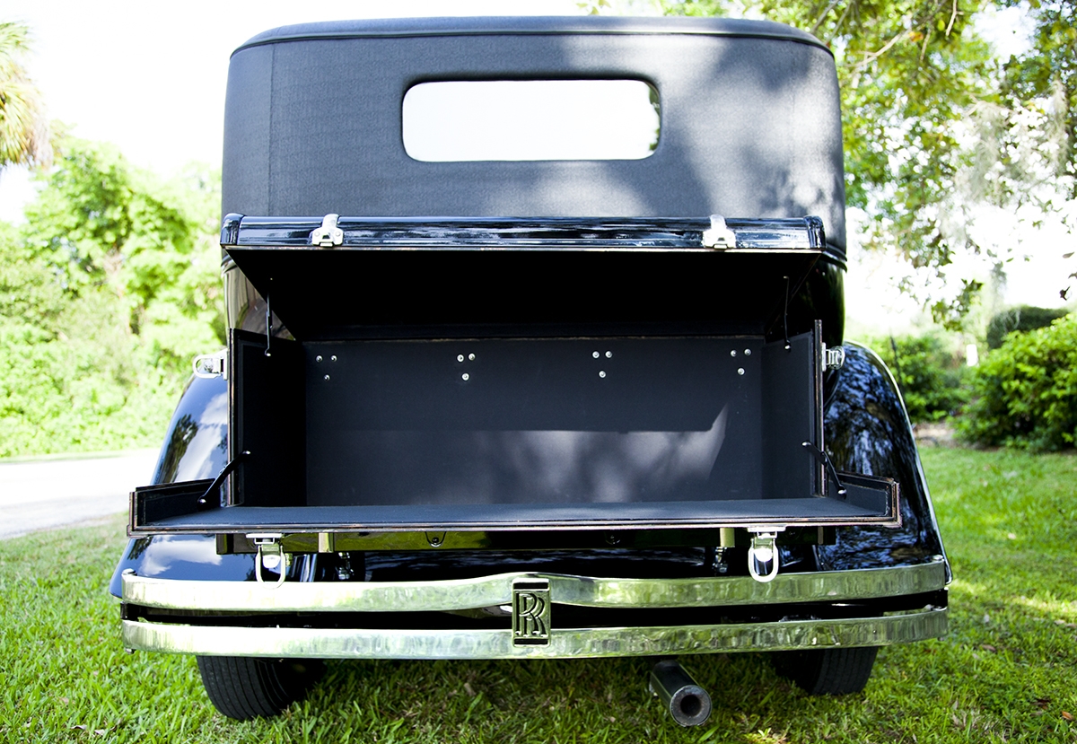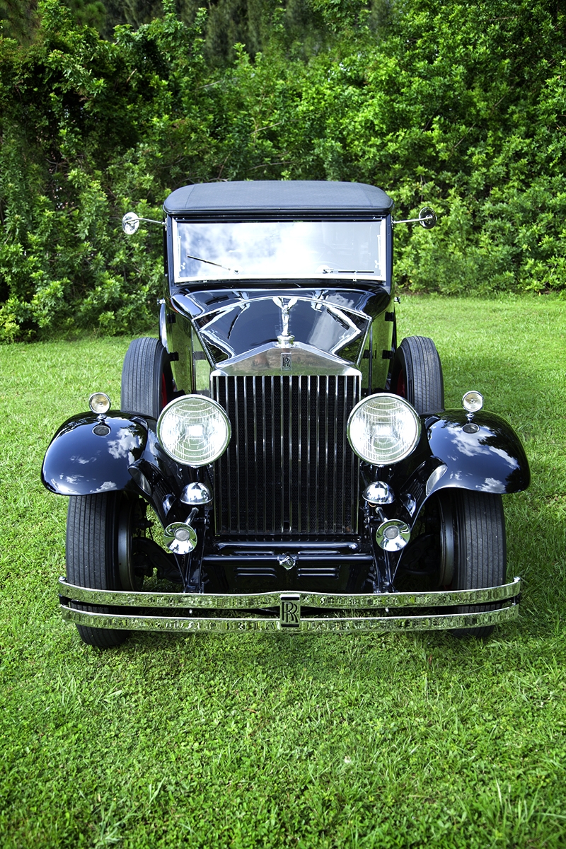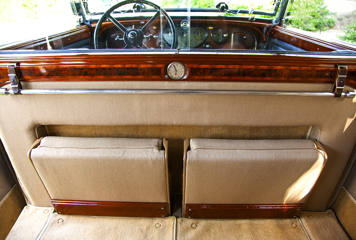 The interior upholstery has been freshly installed by a marquee specialist. New black leather front seats, and complete West of England cloth rear compartment complimented with beautiful original, newly refinished in lacquer wood trim. Finishing touches include new silk screens for privacy, beautiful accents on interior and glossy black trunk for rear of car. The top and headliner have been completely restored in period correct fabrics. This exquisite Phantom II, has been beautifully restored and is ready for the next show, or RROC driving tour.