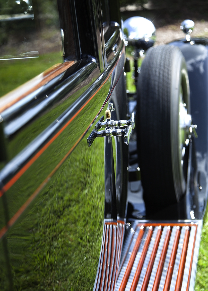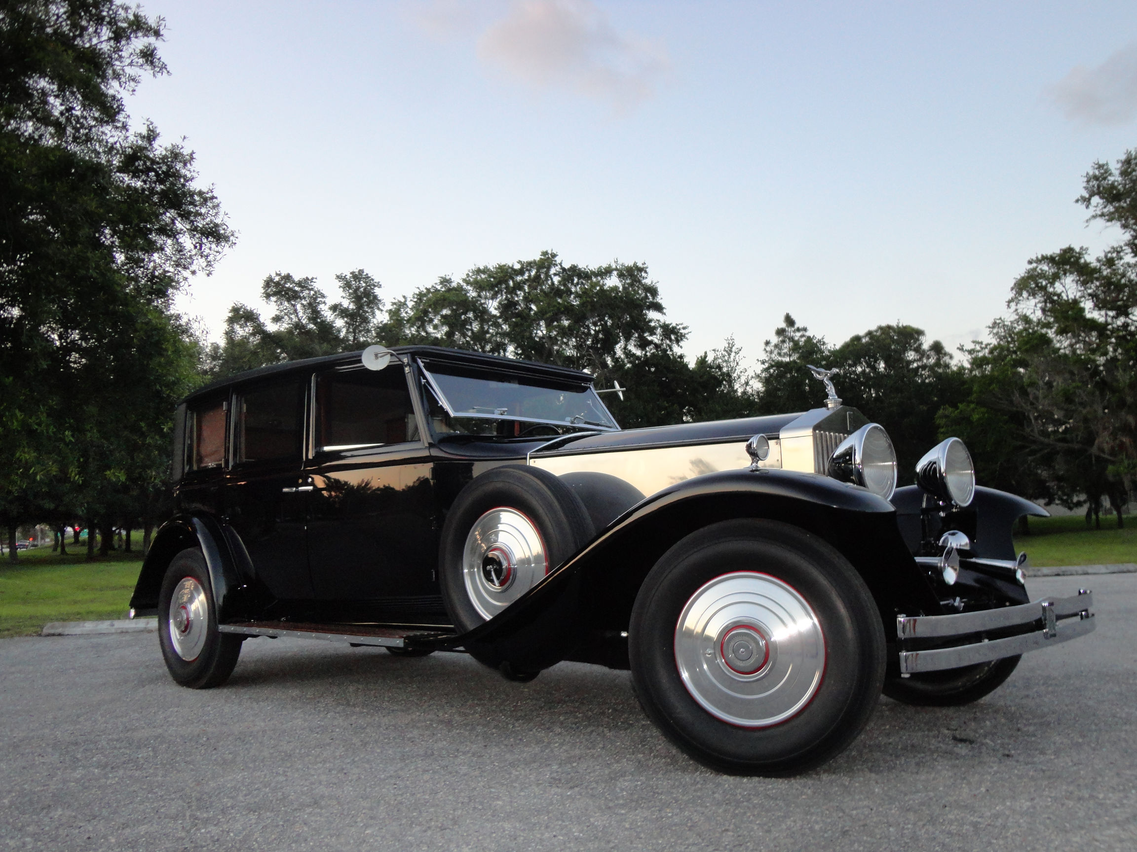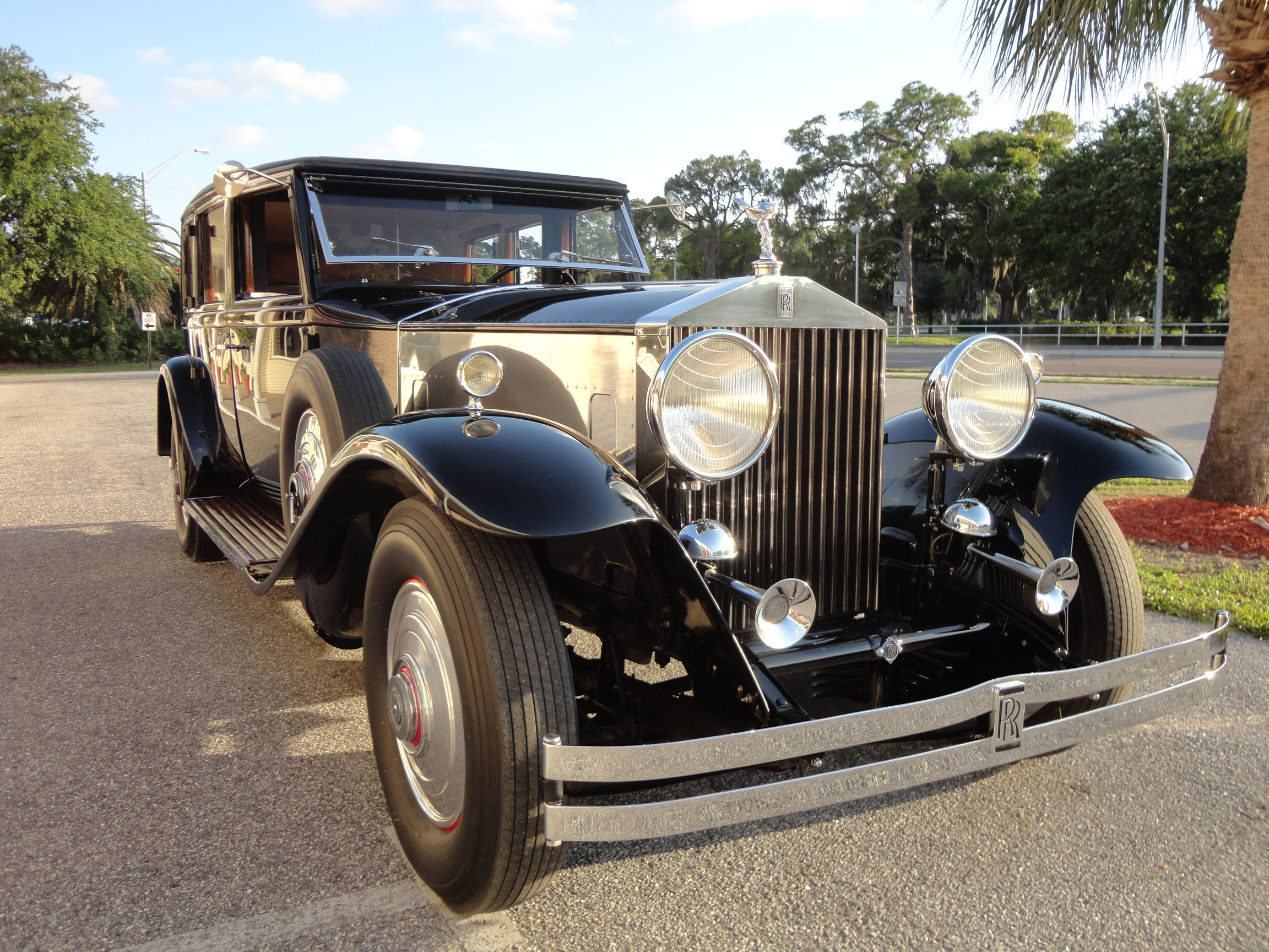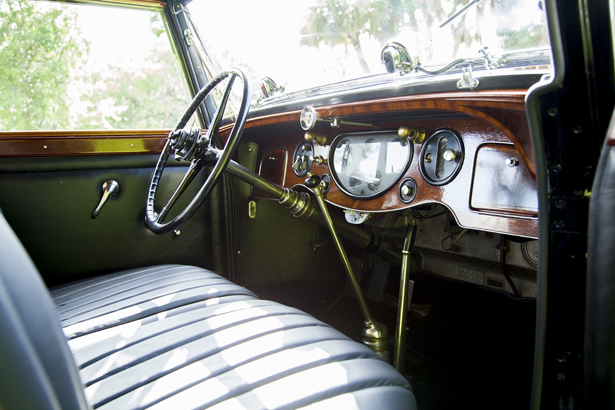 The interior upholstery has been freshly installed by a marquee specialist. New black leather front seats, and complete West of England cloth rear compartment complimented with beautiful original, newly refinished in lacquer wood trim. Finishing touches include new silk screens for privacy, beautiful accents on interior and glossy black trunk for rear of car. The top and headliner have been completely restored in period correct fabrics. This exquisite Phantom II, has been beautifully restored and is ready for the next show, or RROC driving tour.