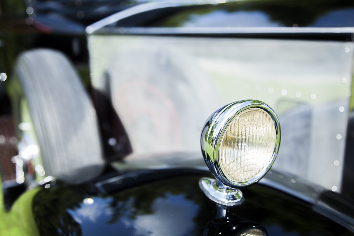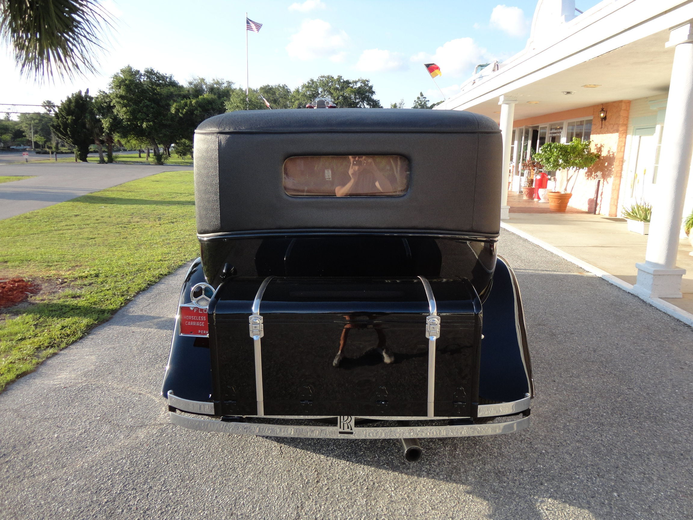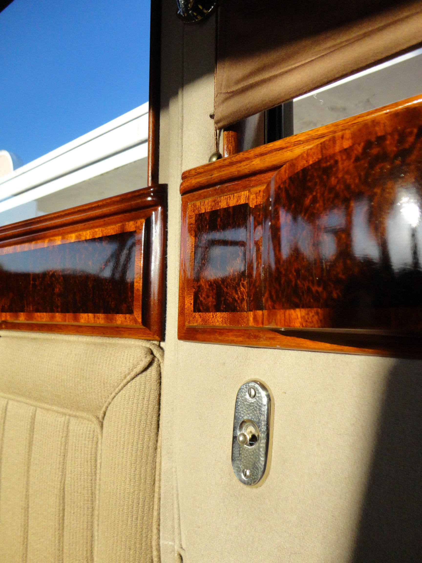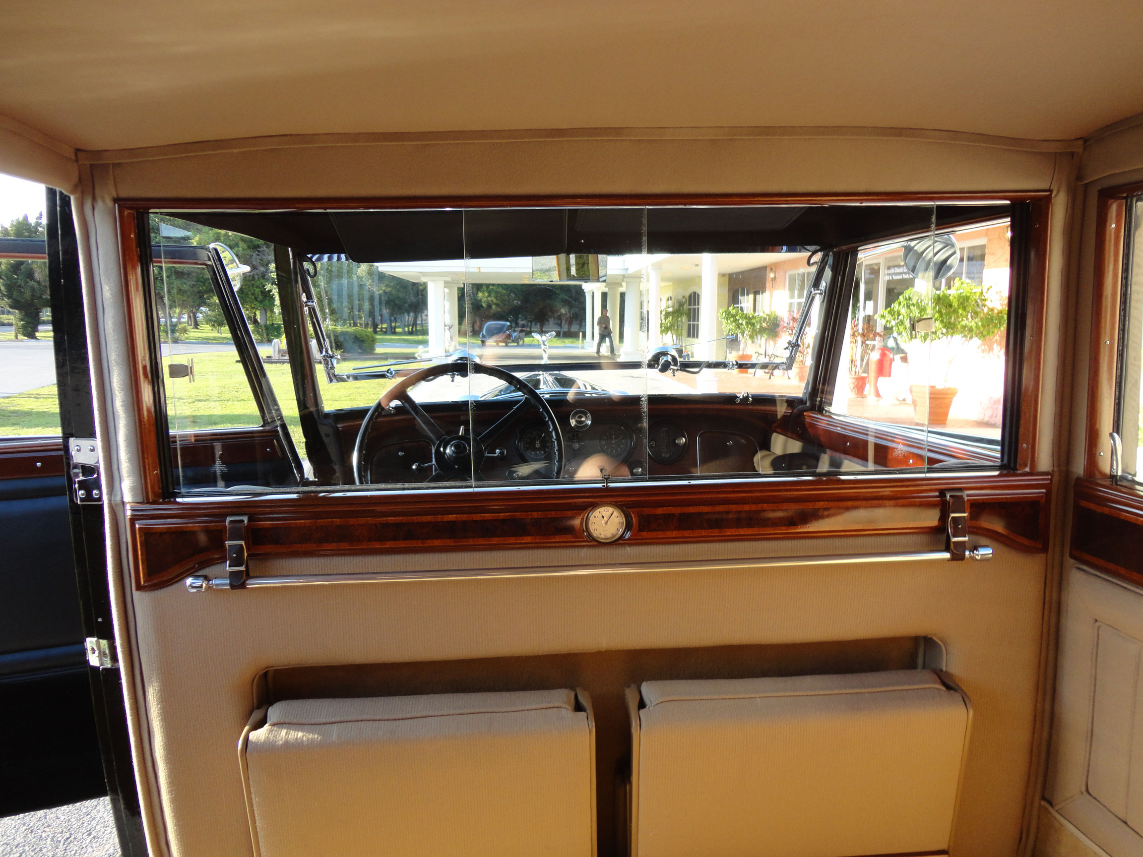 The interior upholstery has been freshly installed by a marquee specialist. New black leather front seats, and complete West of England cloth rear compartment complimented with beautiful original, newly refinished in lacquer wood trim. Finishing touches include new silk screens for privacy, beautiful accents on interior and glossy black trunk for rear of car. The top and headliner have been completely restored in period correct fabrics. This exquisite Phantom II, has been beautifully restored and is ready for the next show, or RROC driving tour.