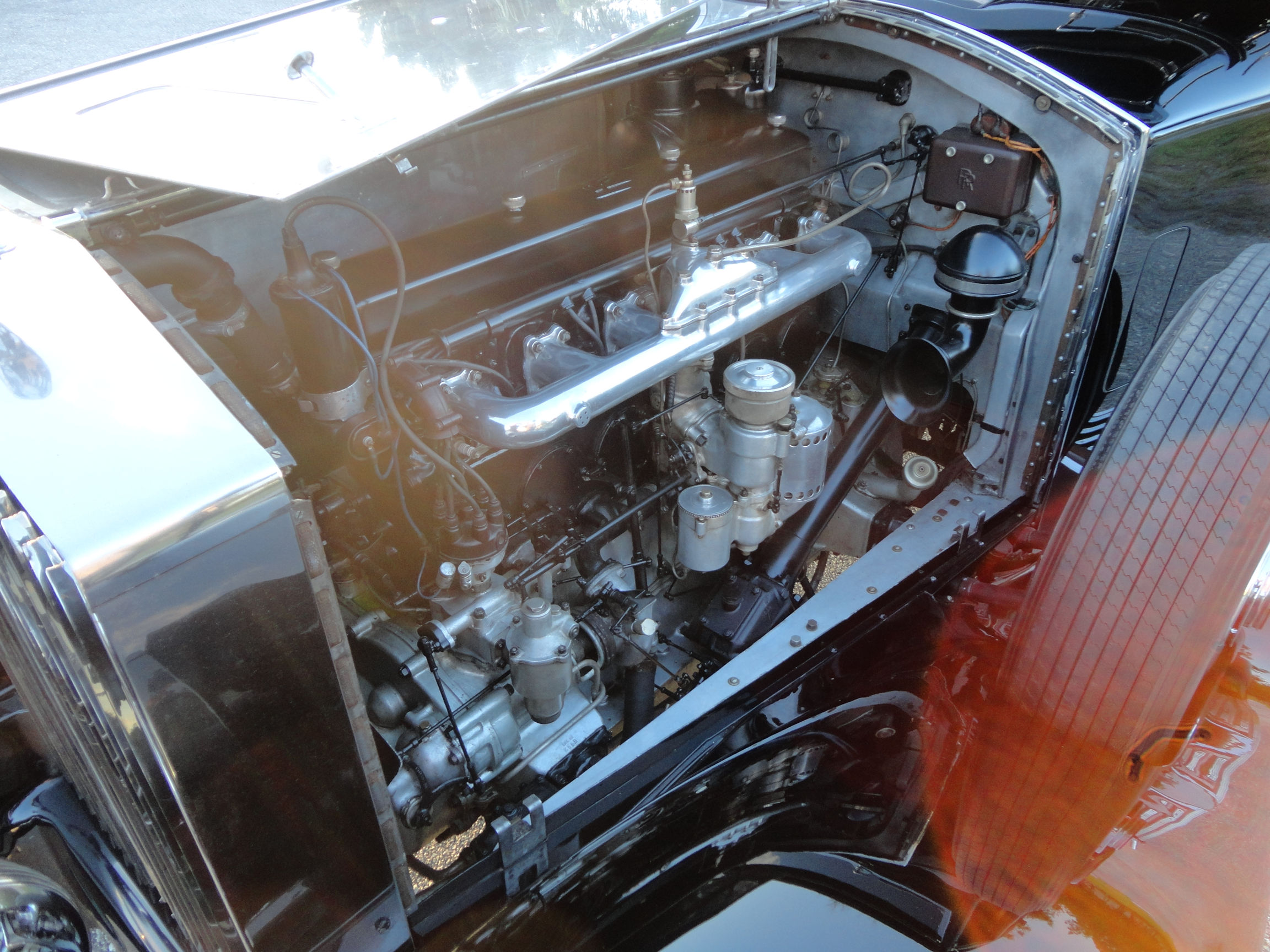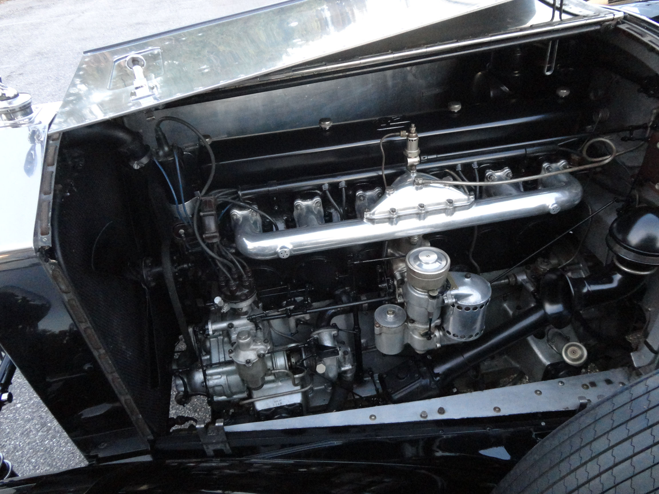 The fenders and body have been recently stripped, and been beautifully painted in Masons Black with polished alloy bonnet sides. The car is equipped with 6 newly polished wheel discs. Many newly rechromed body parts such as headlights; fenders (wings), front and rear bumpers, wing lamps, bumper badges, and rear tail light were professionally refinished.