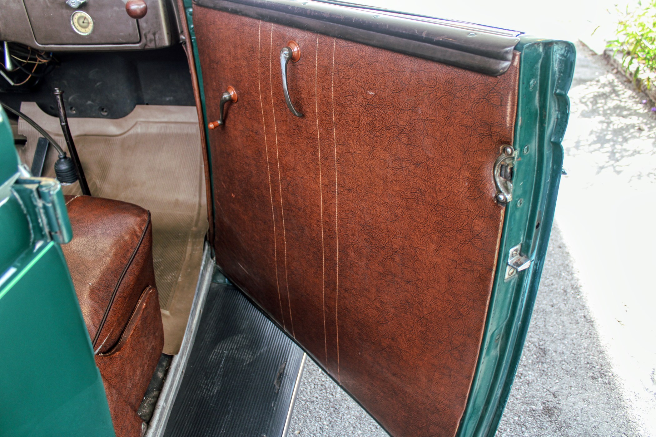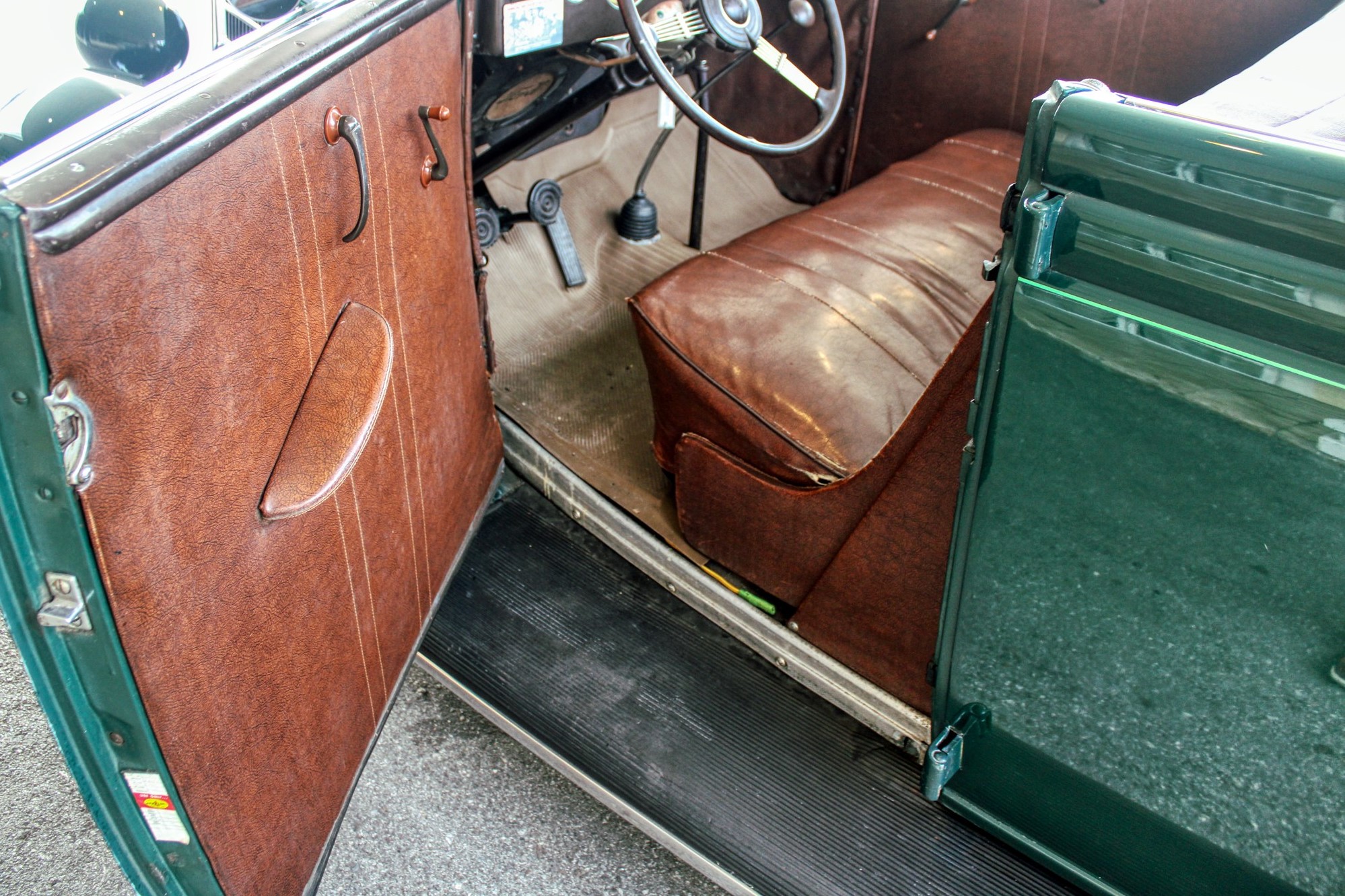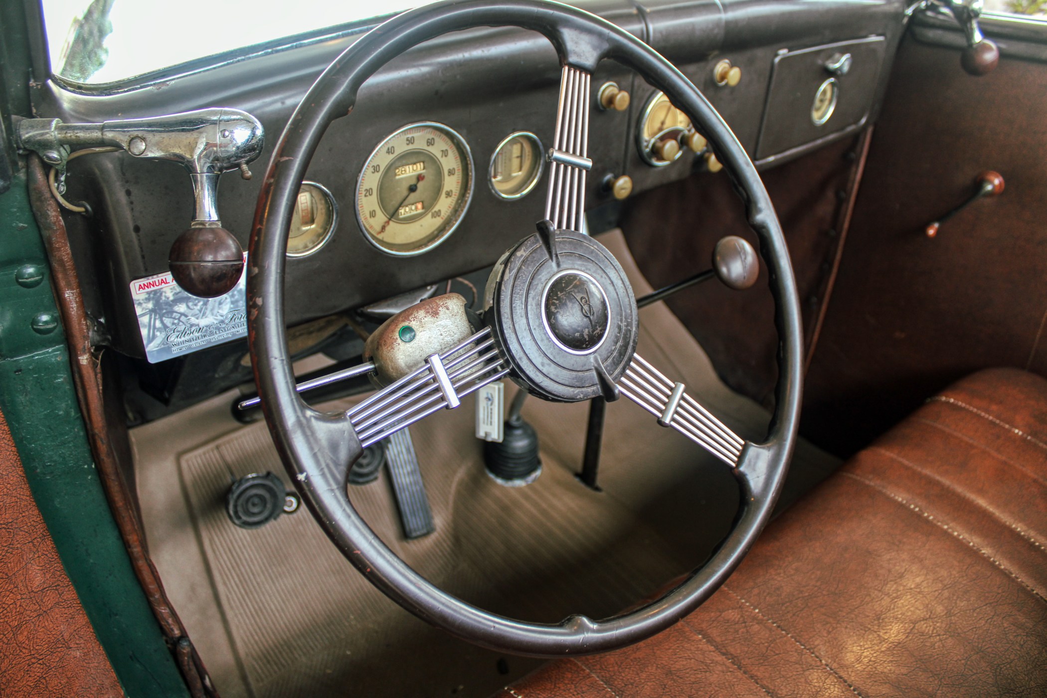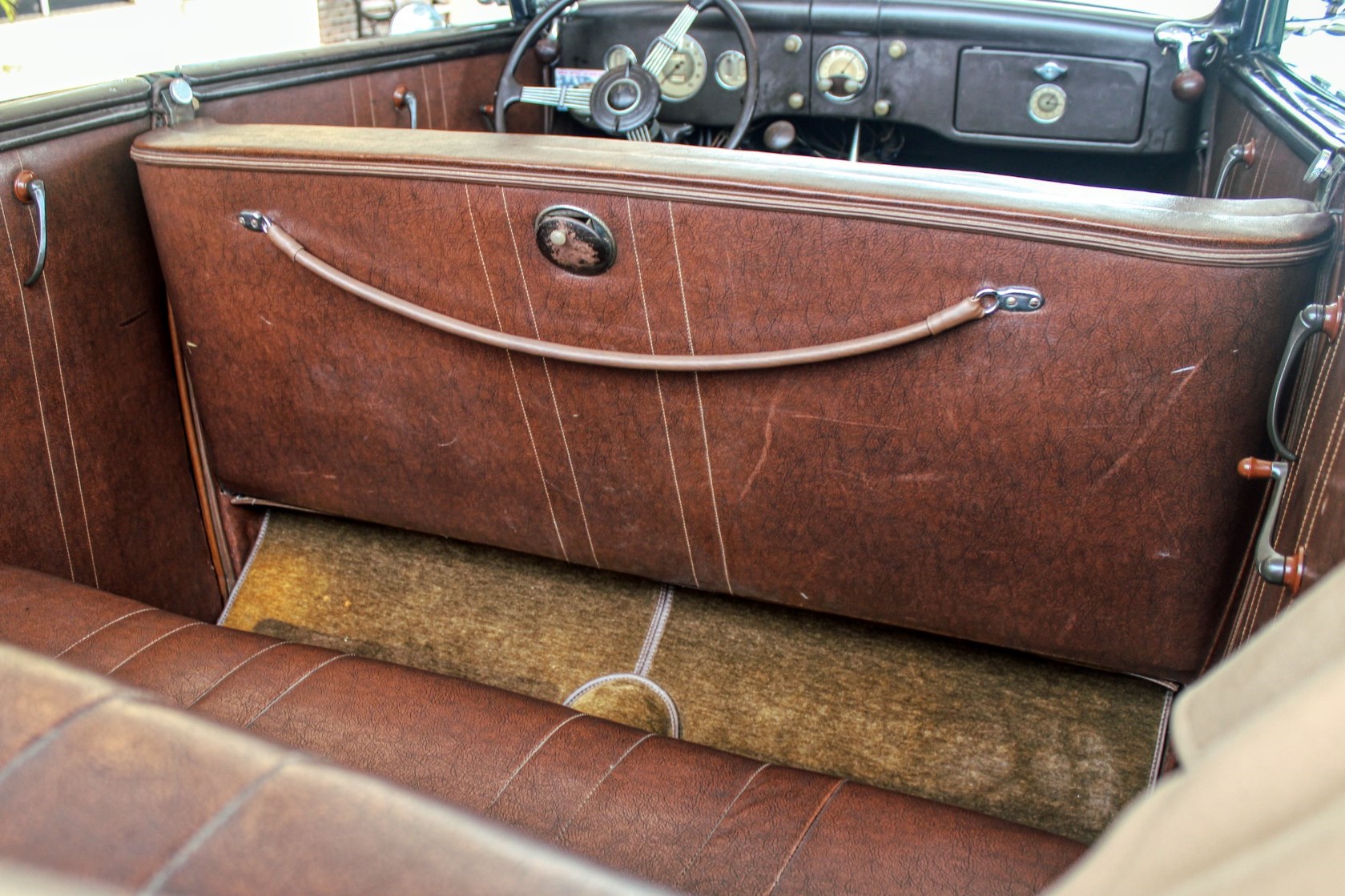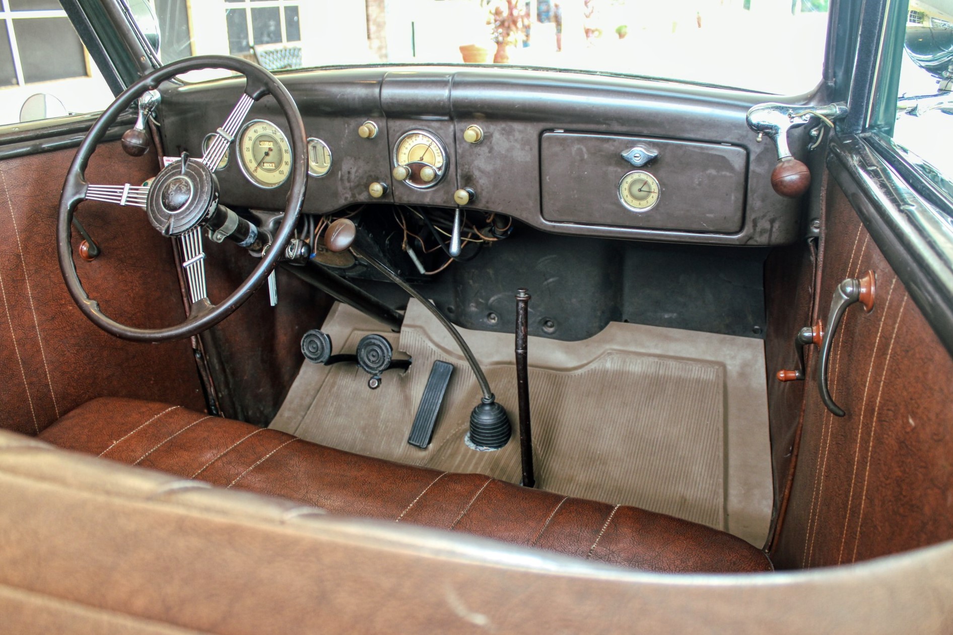 This 1936 convertible’s warm and welcoming interior is a look back into pre-war America, complete with supple leather, tasteful use of wood graining and awesome Art Deco gauges. The car’s plush brown cockpit centers on big, heavily bolstered seats that feel soft enough to fall asleep in. At the sides of those seats, simple door panels and polished handles. At the bottom of those panels the traditional, round foot pedals flank an old school shifter and heavy-duty floor mats. Above those pedals, the purposeful dash finds attractive Ford gauges behind a simple array of buttons. And in front of the driver, the classic banjo steering wheel frames a “V8” branded column.