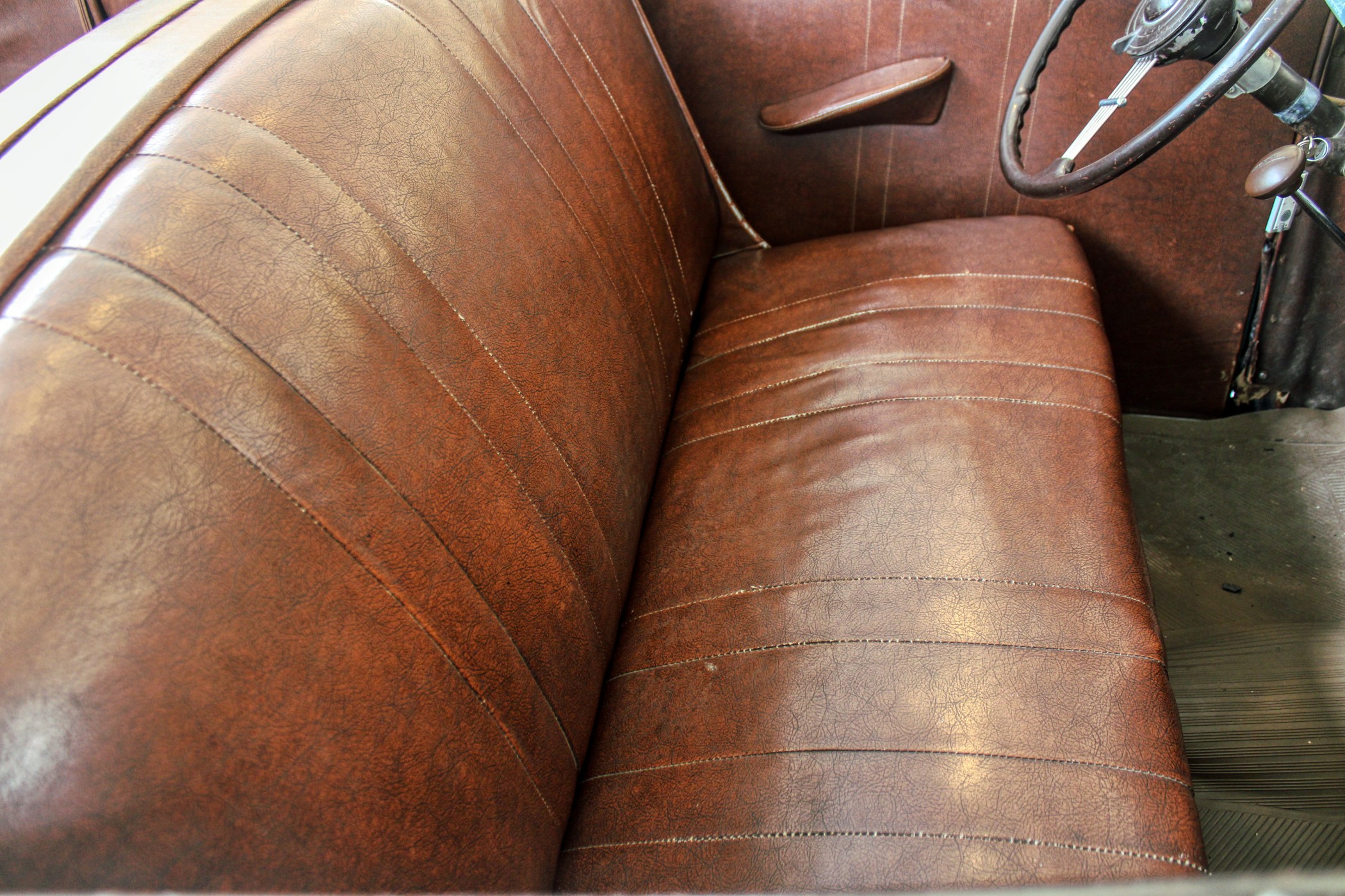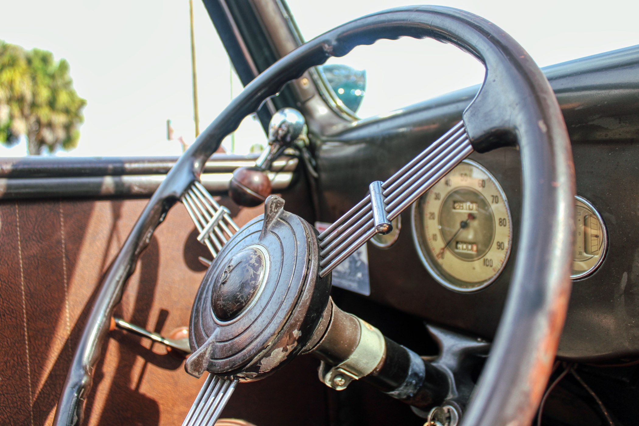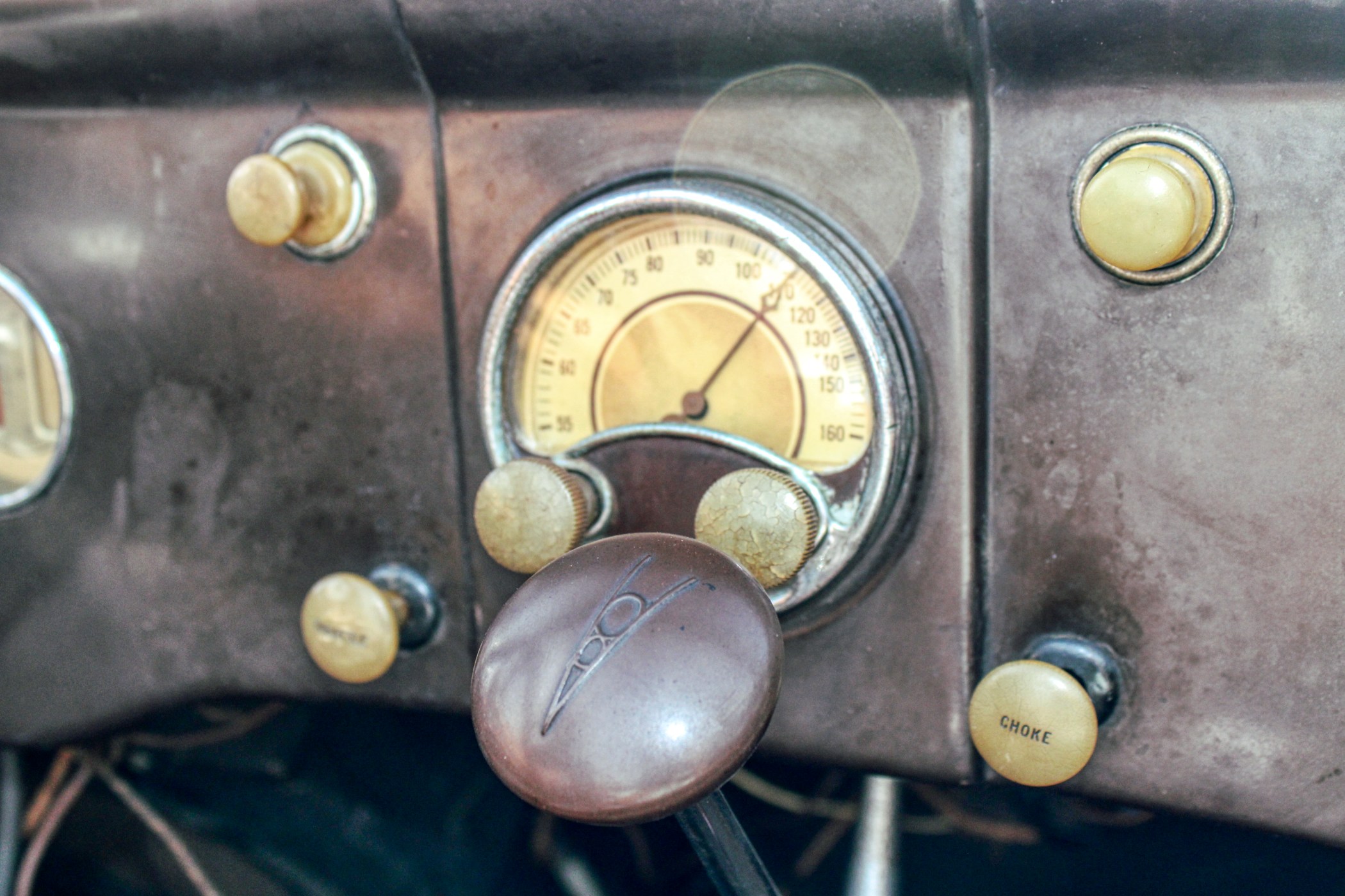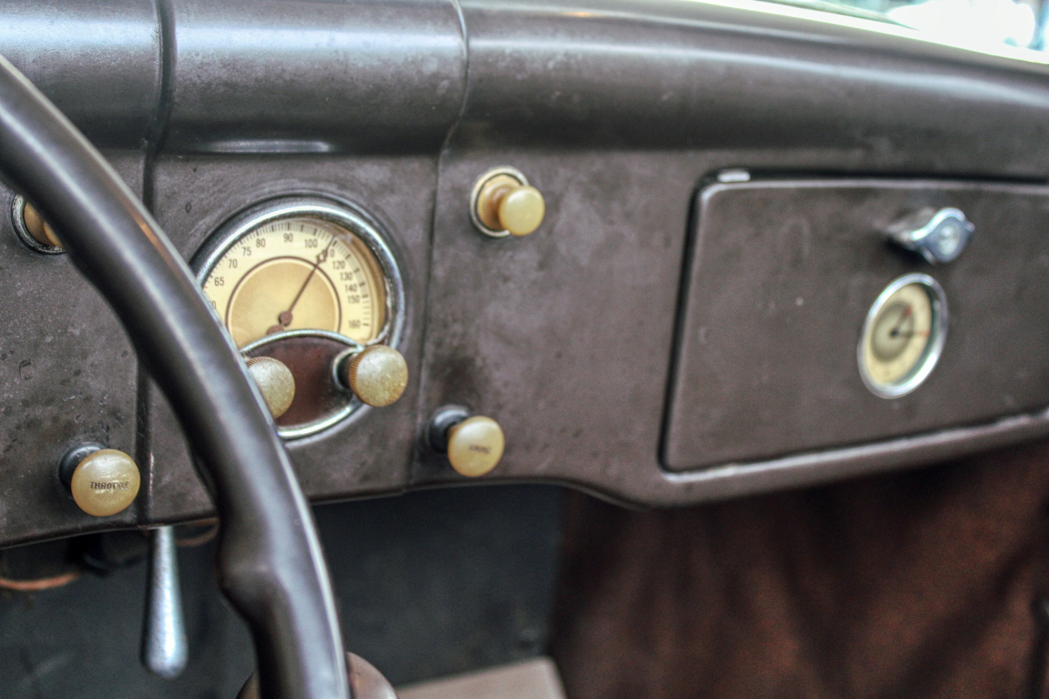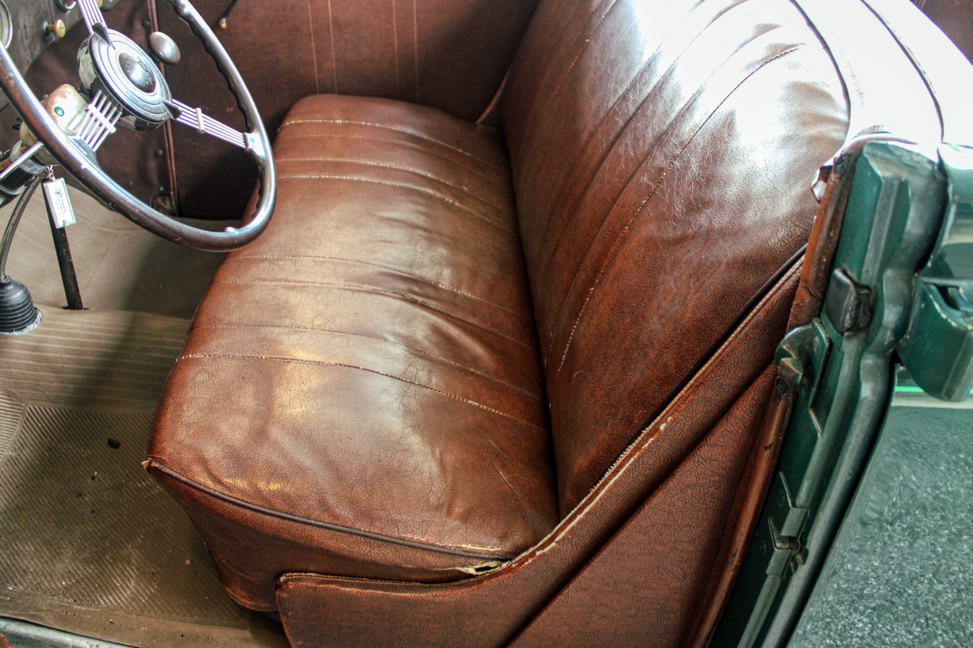 This 1936 convertible’s warm and welcoming interior is a look back into pre-war America, complete with supple leather, tasteful use of wood graining and awesome Art Deco gauges. The car’s plush brown cockpit centers on big, heavily bolstered seats that feel soft enough to fall asleep in. At the sides of those seats, simple door panels and polished handles. At the bottom of those panels the traditional, round foot pedals flank an old school shifter and heavy-duty floor mats. Above those pedals, the purposeful dash finds attractive Ford gauges behind a simple array of buttons. And in front of the driver, the classic banjo steering wheel frames a “V8” branded column.