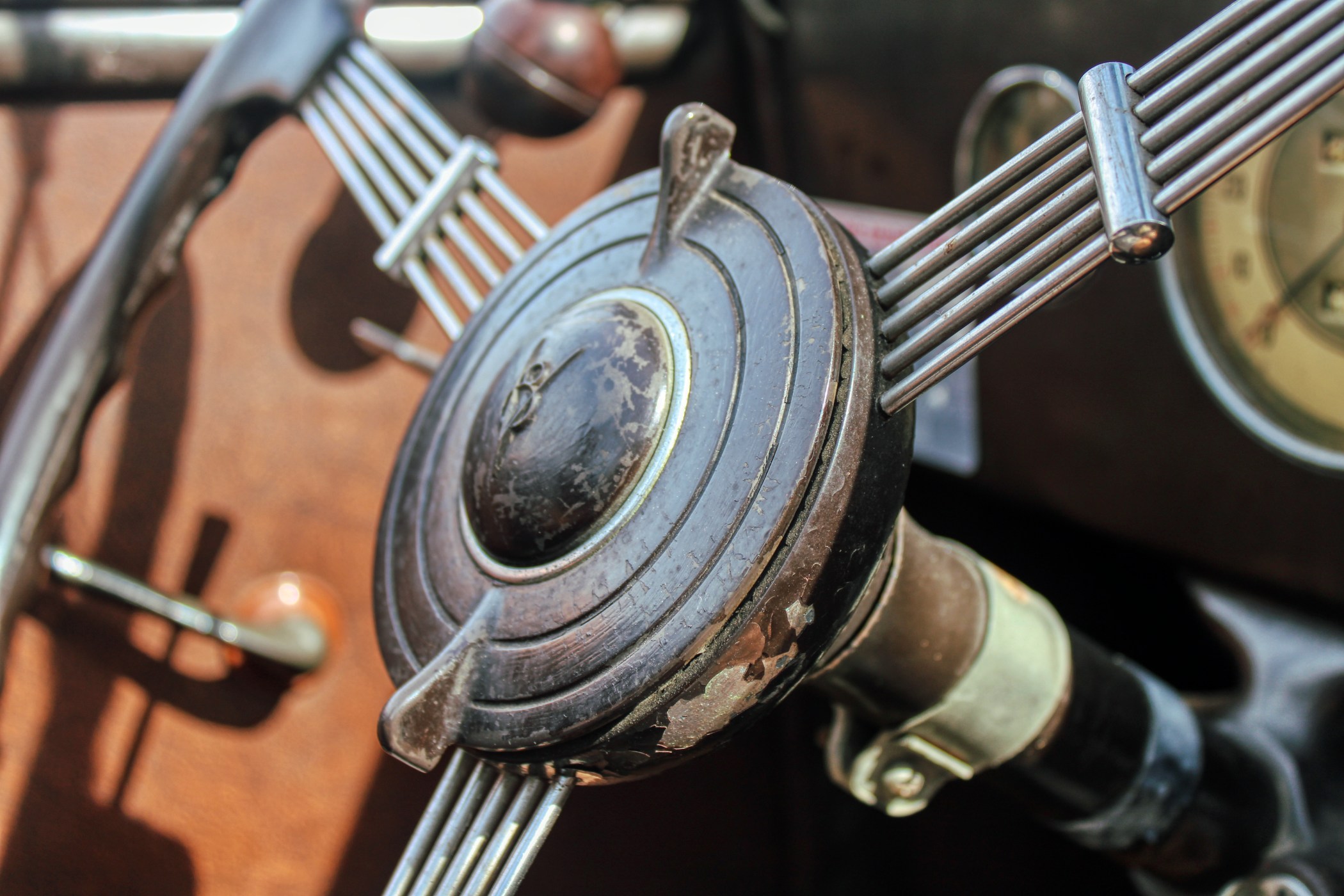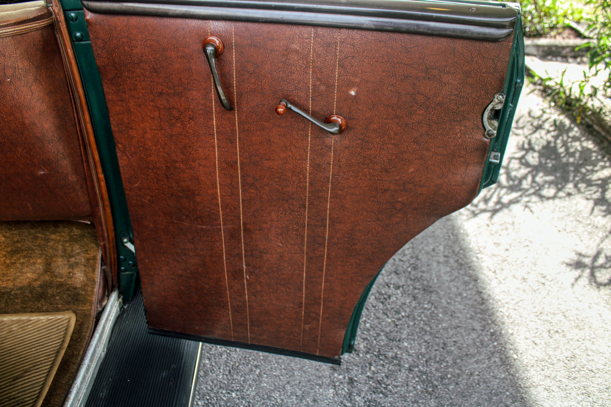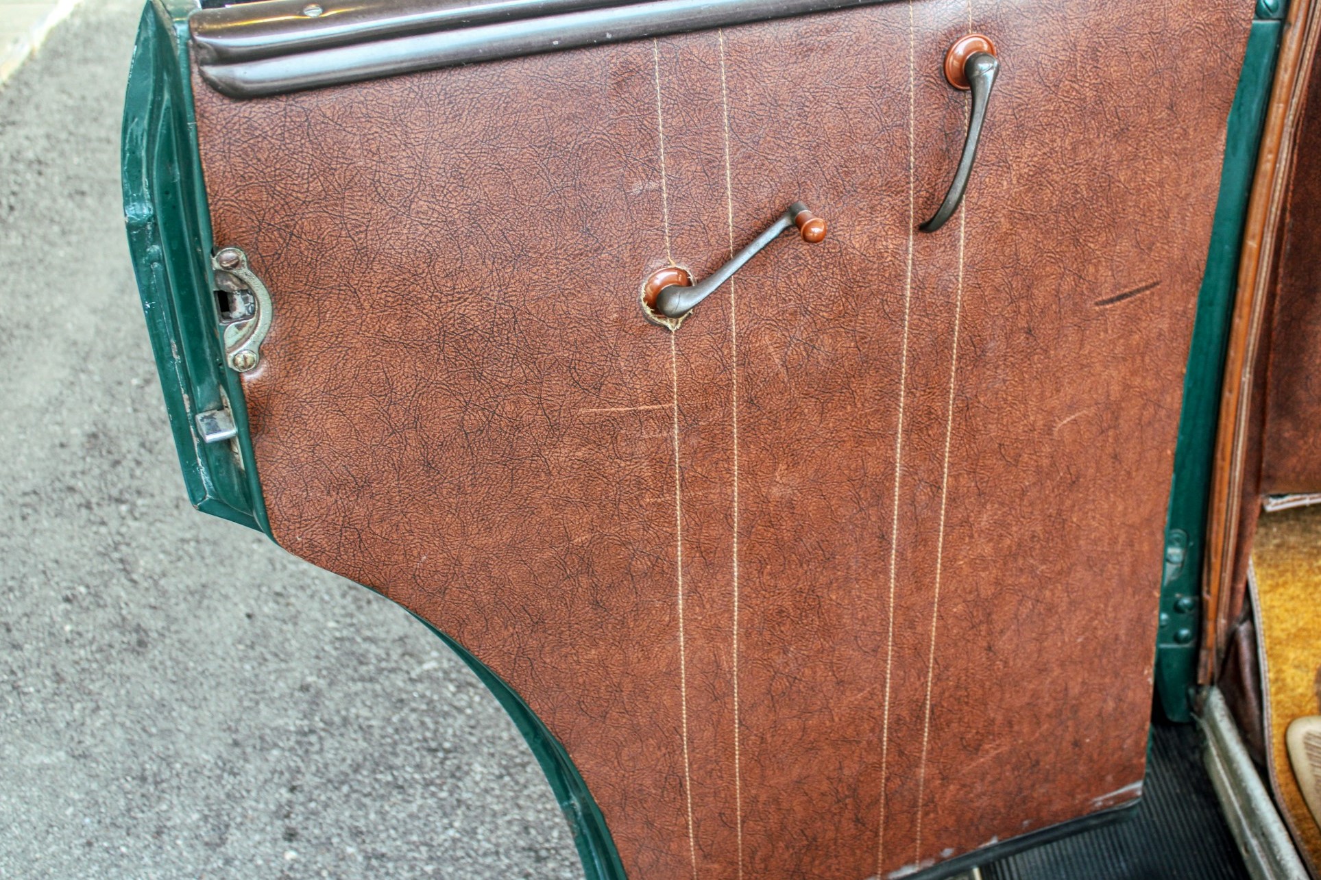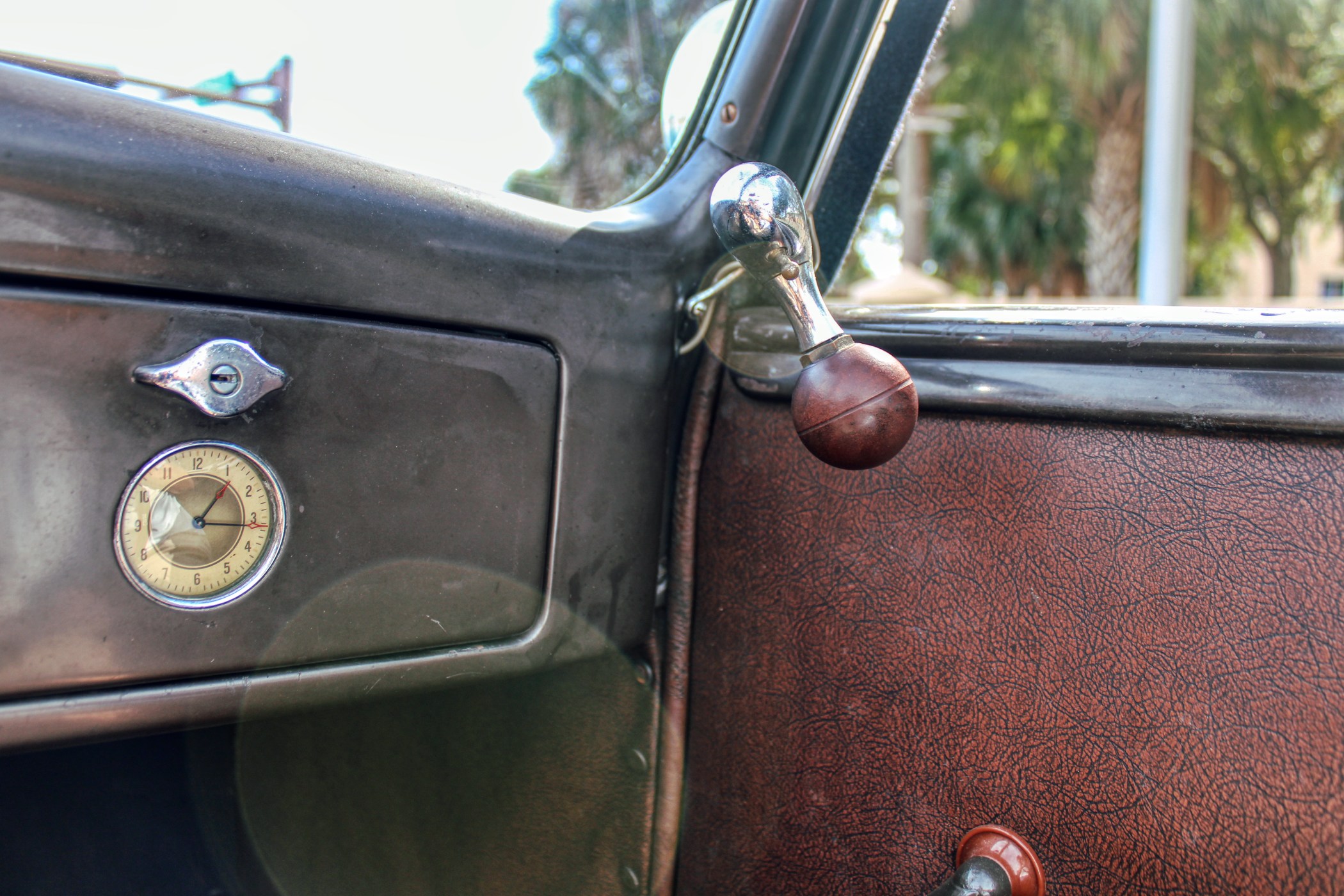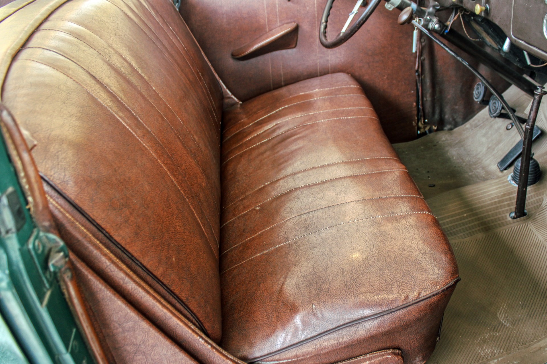 This 1936 convertible’s warm and welcoming interior is a look back into pre-war America, complete with supple leather, tasteful use of wood graining and awesome Art Deco gauges. The car’s plush brown cockpit centers on big, heavily bolstered seats that feel soft enough to fall asleep in. At the sides of those seats, simple door panels and polished handles. At the bottom of those panels the traditional, round foot pedals flank an old school shifter and heavy-duty floor mats. Above those pedals, the purposeful dash finds attractive Ford gauges behind a simple array of buttons. And in front of the driver, the classic banjo steering wheel frames a “V8” branded column.
