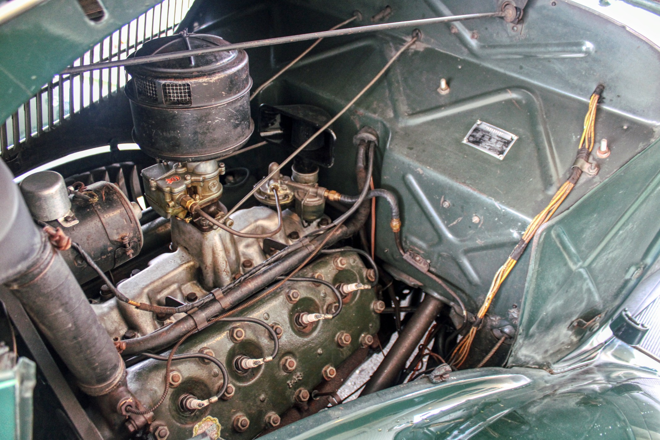 85 bhp, 221 cu. in. L-head V-8 engine, three-speed manual transmission, solid front axle and live rear axle with transverse semi-elliptic leaf springs, and four-wheel mechanical drum brakes. Wheelbase: 112 in.
