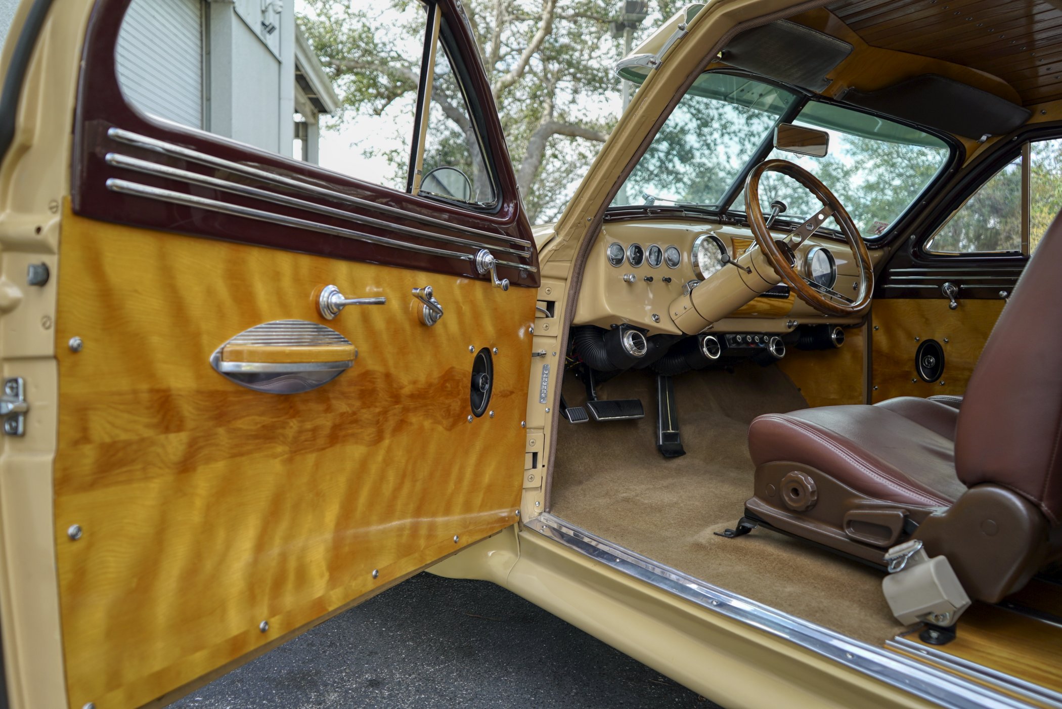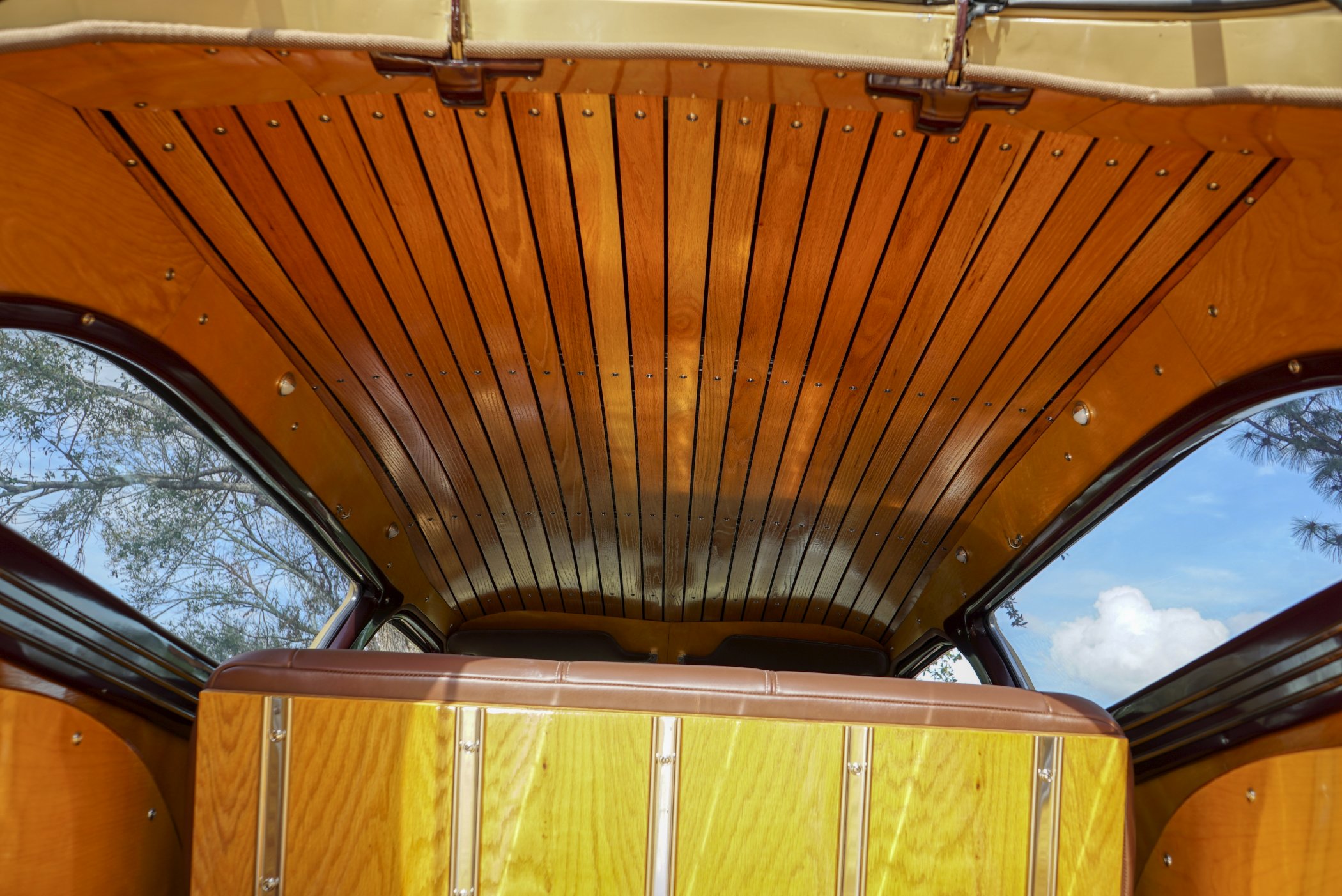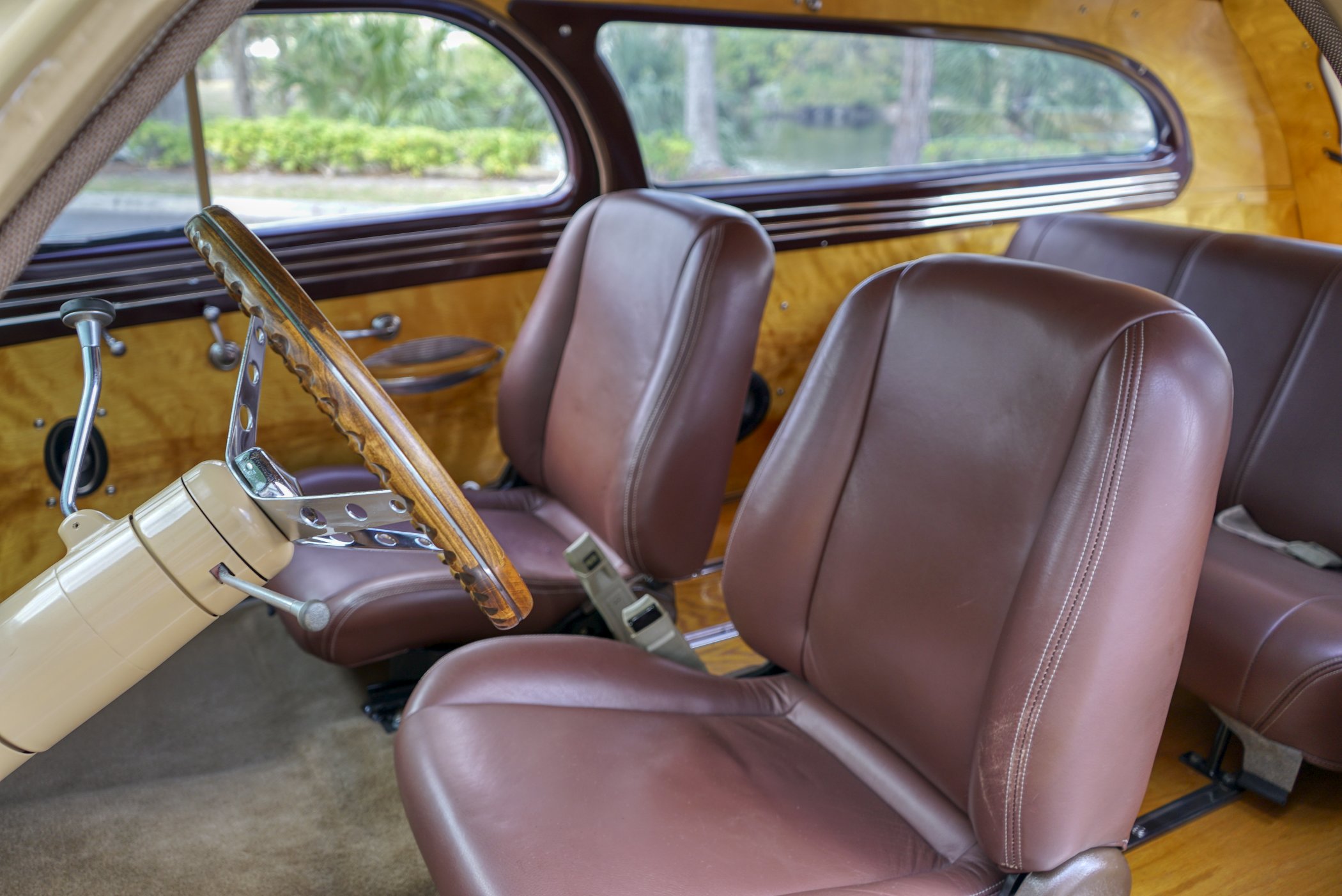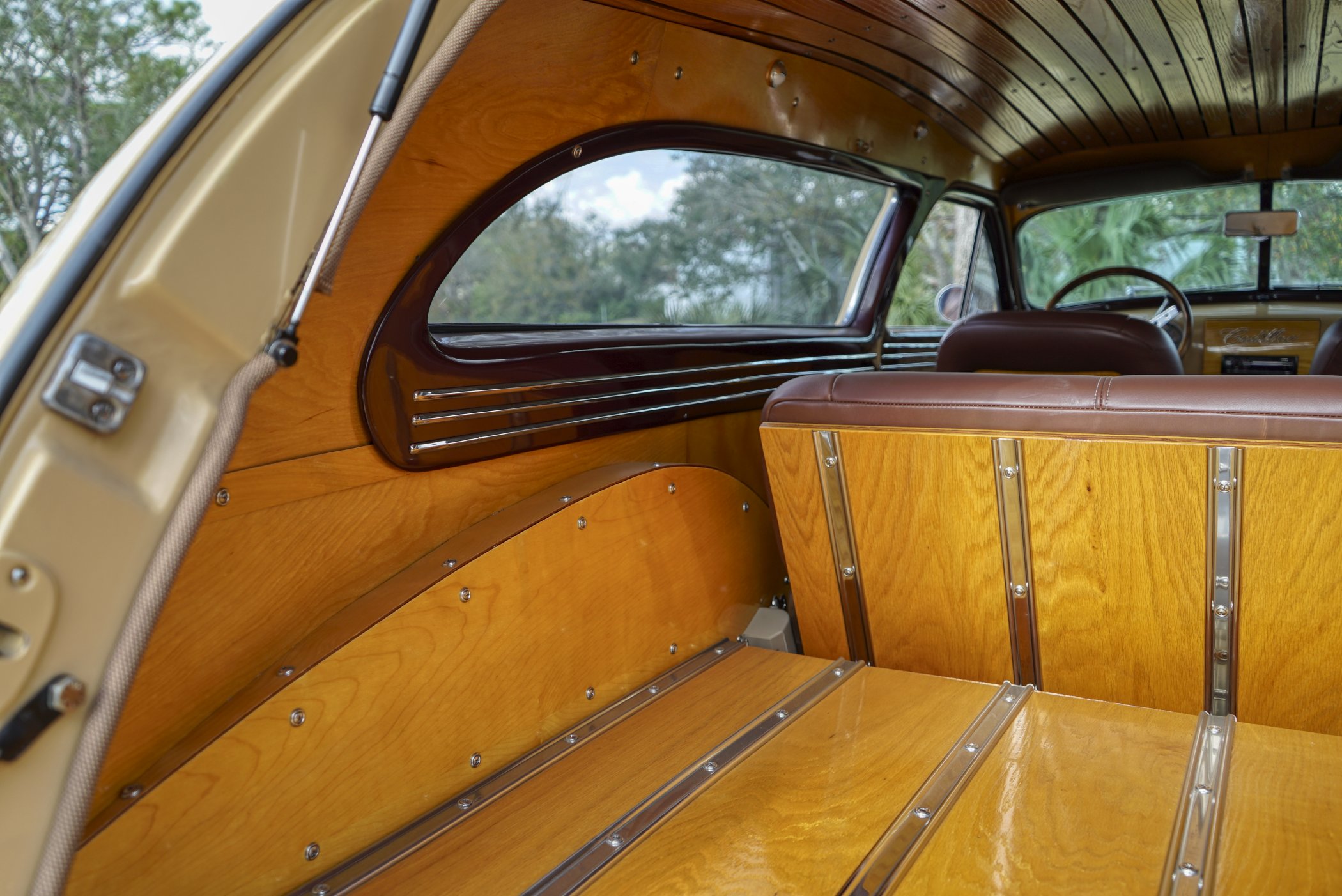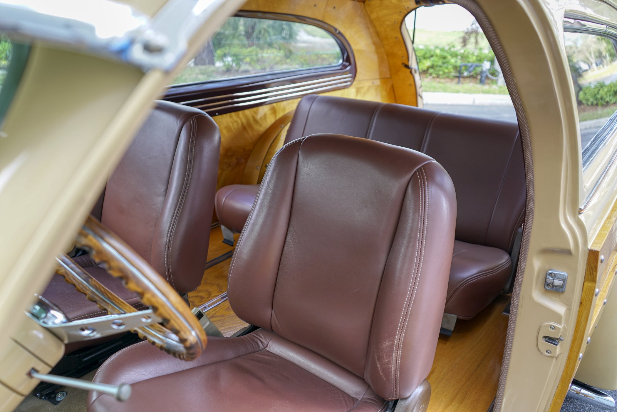 Equipped with period chrome trimmed sun visor and long and sleek metal and chrome 1940’s styled triple chrome accented rear side windows. Measuring 18′ 10 1/2″ with well crafted full wood interior of ash paneling throughout and wood slatted headliner. Precision leather crafted front bucket seats and a fold down comfortable leather crafted stitched rear seat folding down to continue the wood floor theme from rear door to front seats. Powered by a newer venerable Cadillac 429 V-8matted to a 4-speed automatic transmission riding on a comfortable Fleetwood suspension riding on 16″ wheels with dual system power disc braking to the front. Fully equipped with power steering, power breaks, and Vintage Air and Heating.