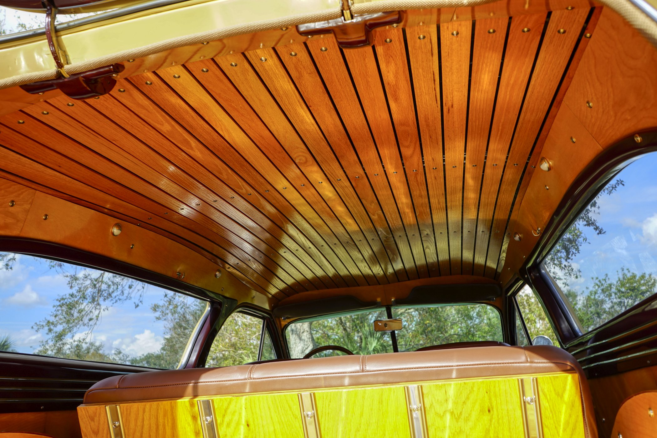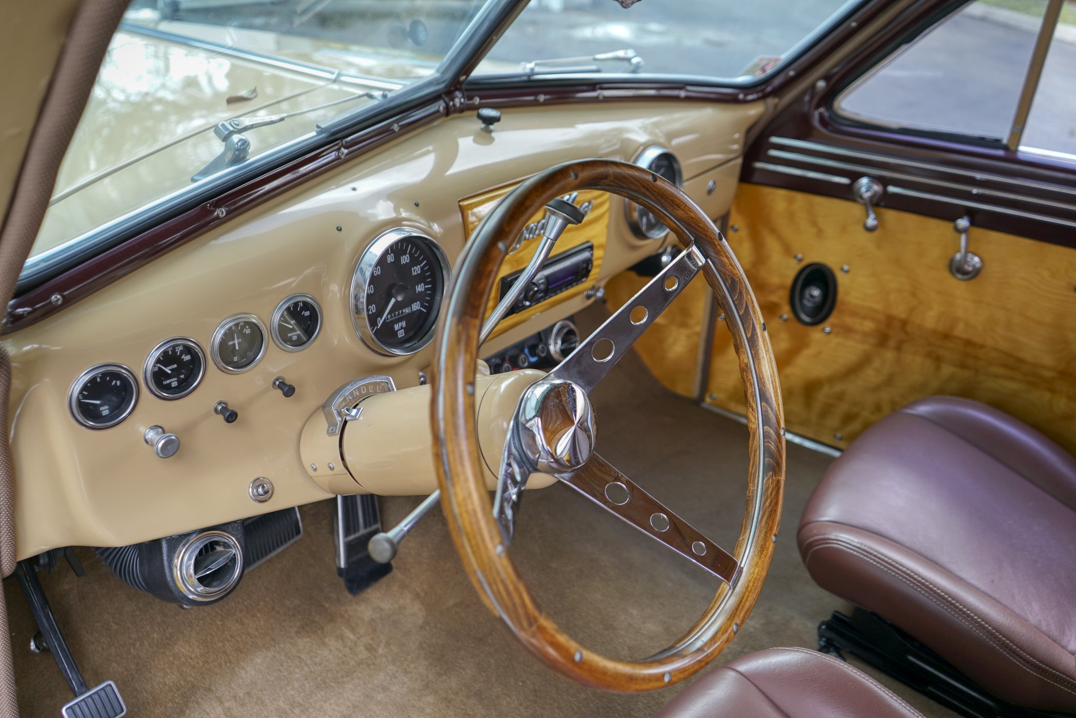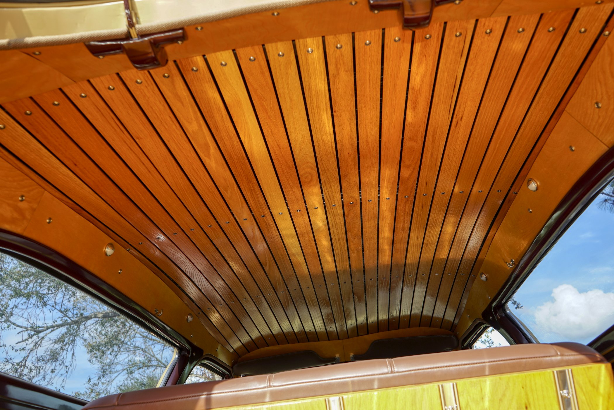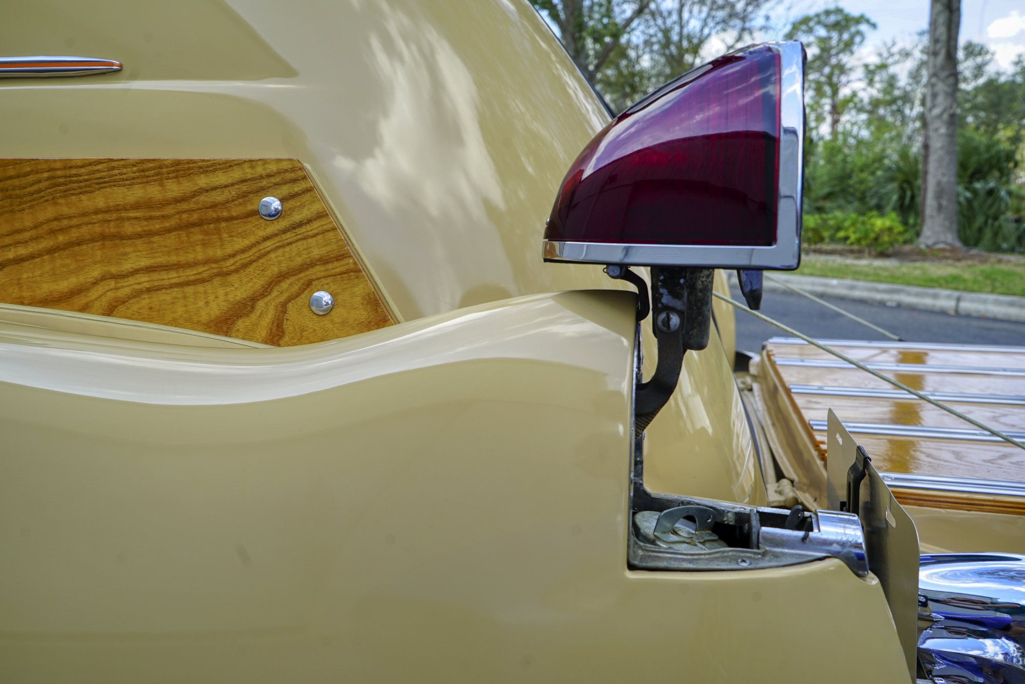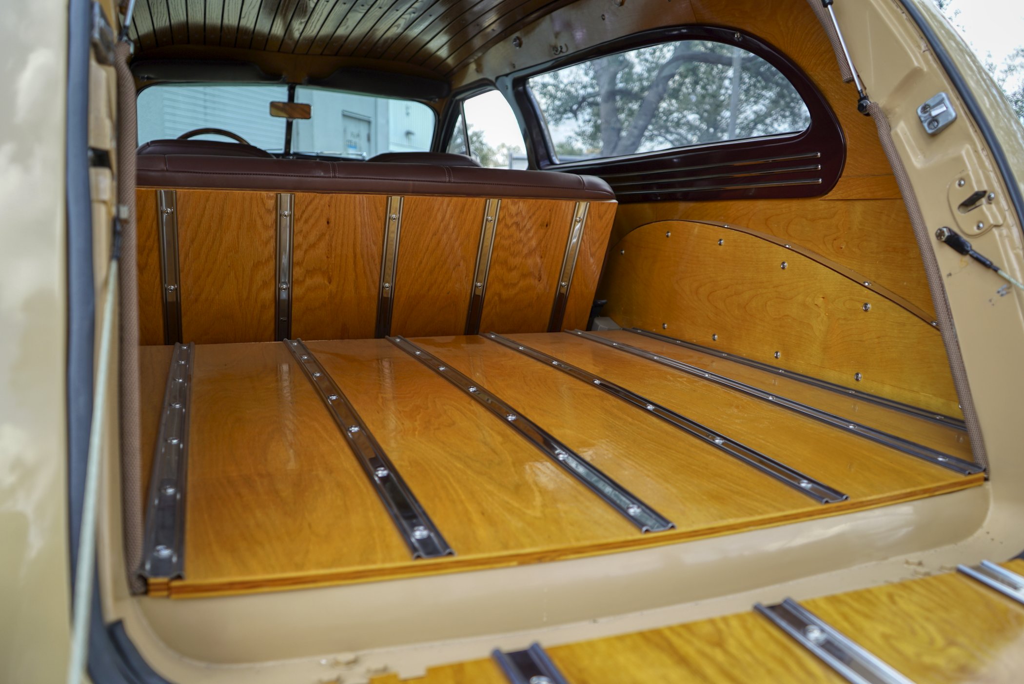 Equipped with period chrome trimmed sun visor and long and sleek metal and chrome 1940’s styled triple chrome accented rear side windows. Measuring 18′ 10 1/2″ with well crafted full wood interior of ash paneling throughout and wood slatted headliner. Precision leather crafted front bucket seats and a fold down comfortable leather crafted stitched rear seat folding down to continue the wood floor theme from rear door to front seats. Powered by a newer venerable Cadillac 429 V-8matted to a 4-speed automatic transmission riding on a comfortable Fleetwood suspension riding on 16″ wheels with dual system power disc braking to the front. Fully equipped with power steering, power breaks, and Vintage Air and Heating.