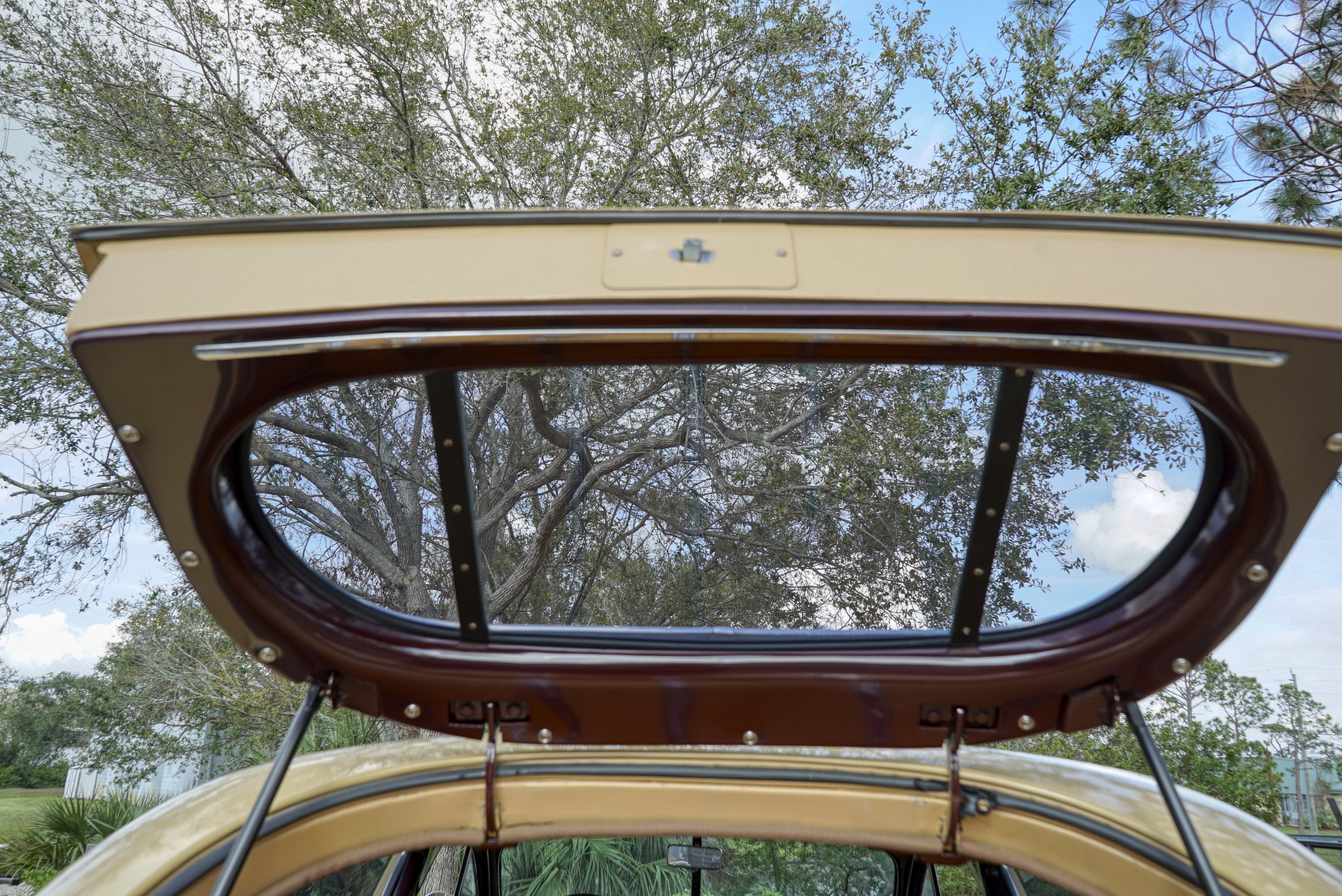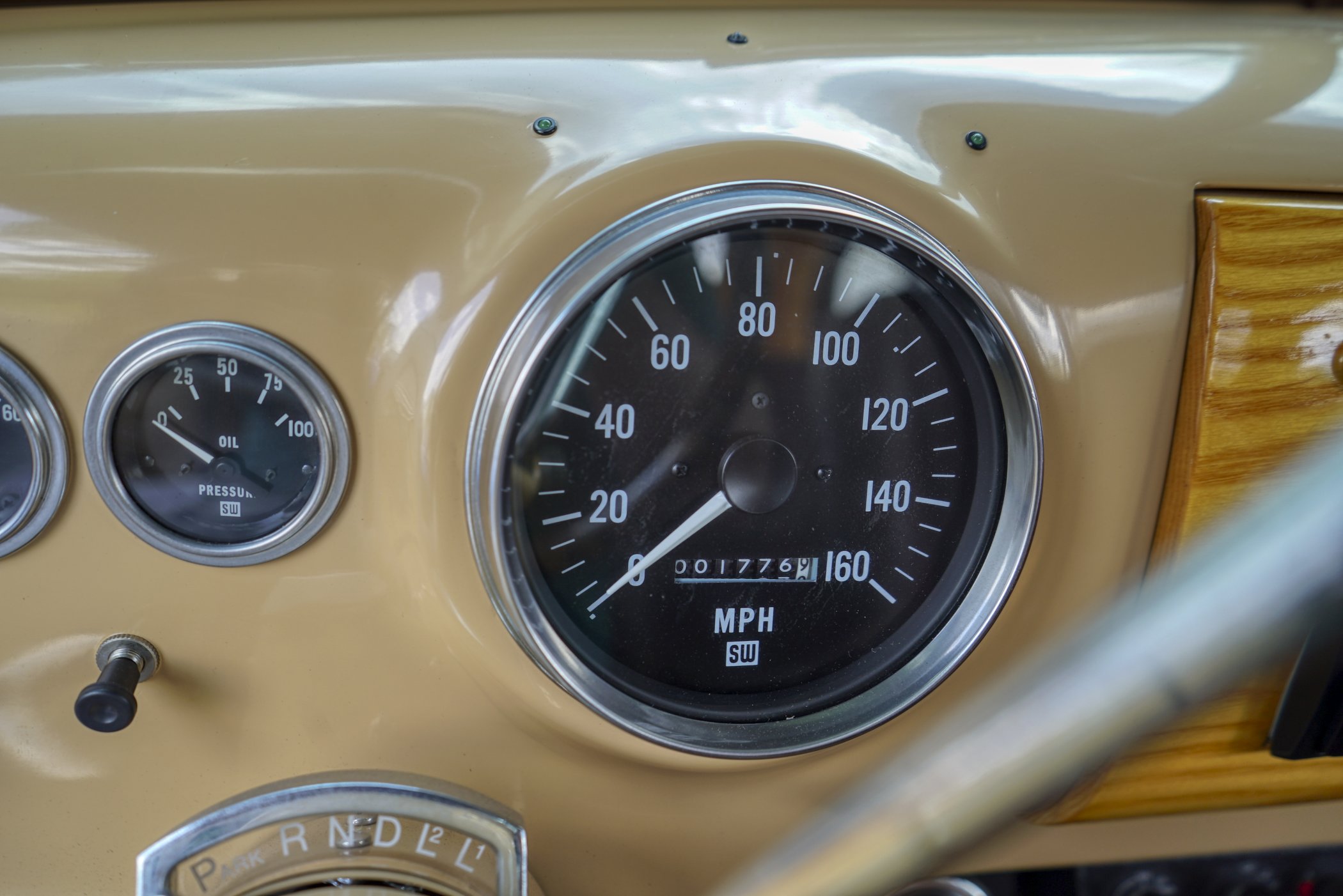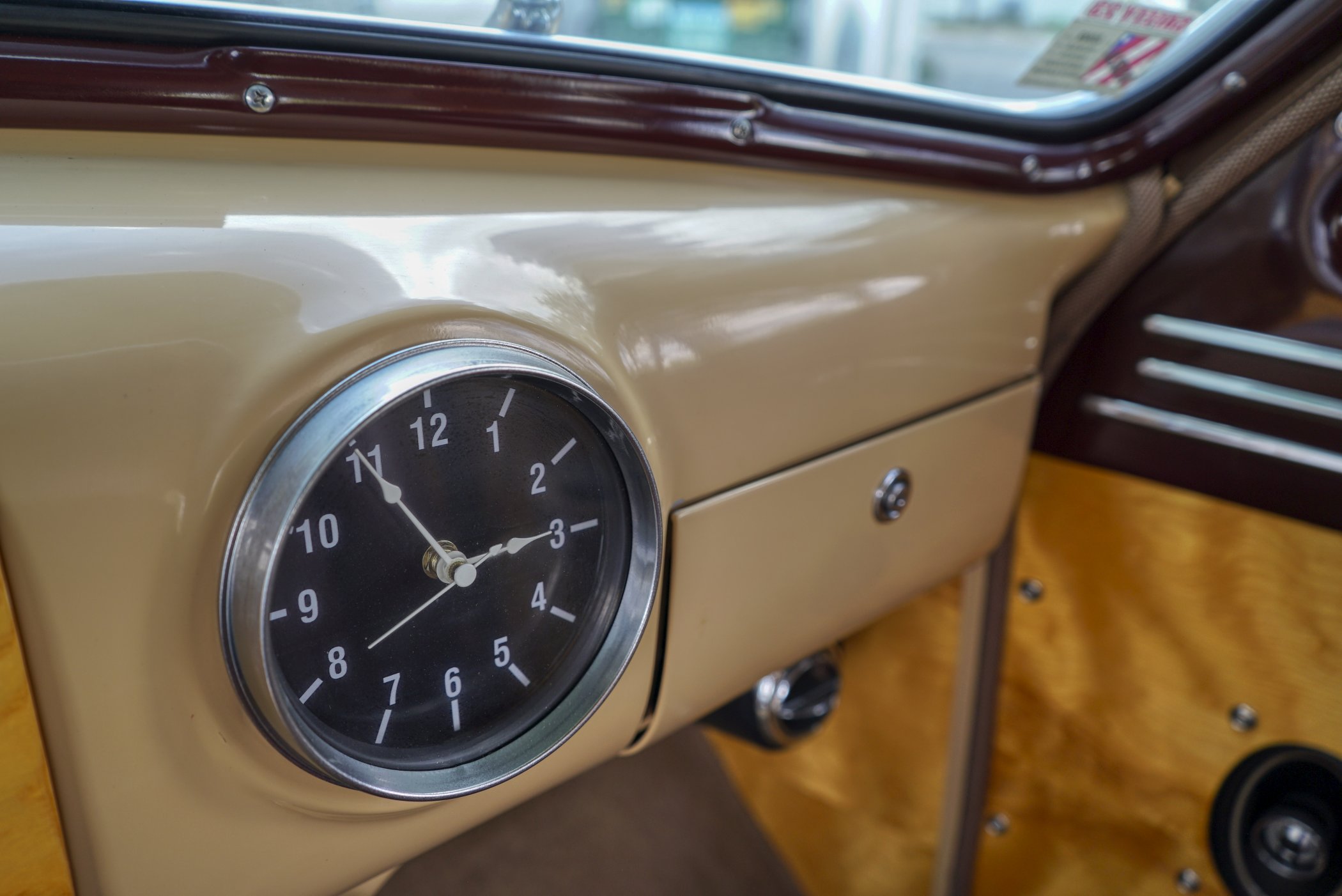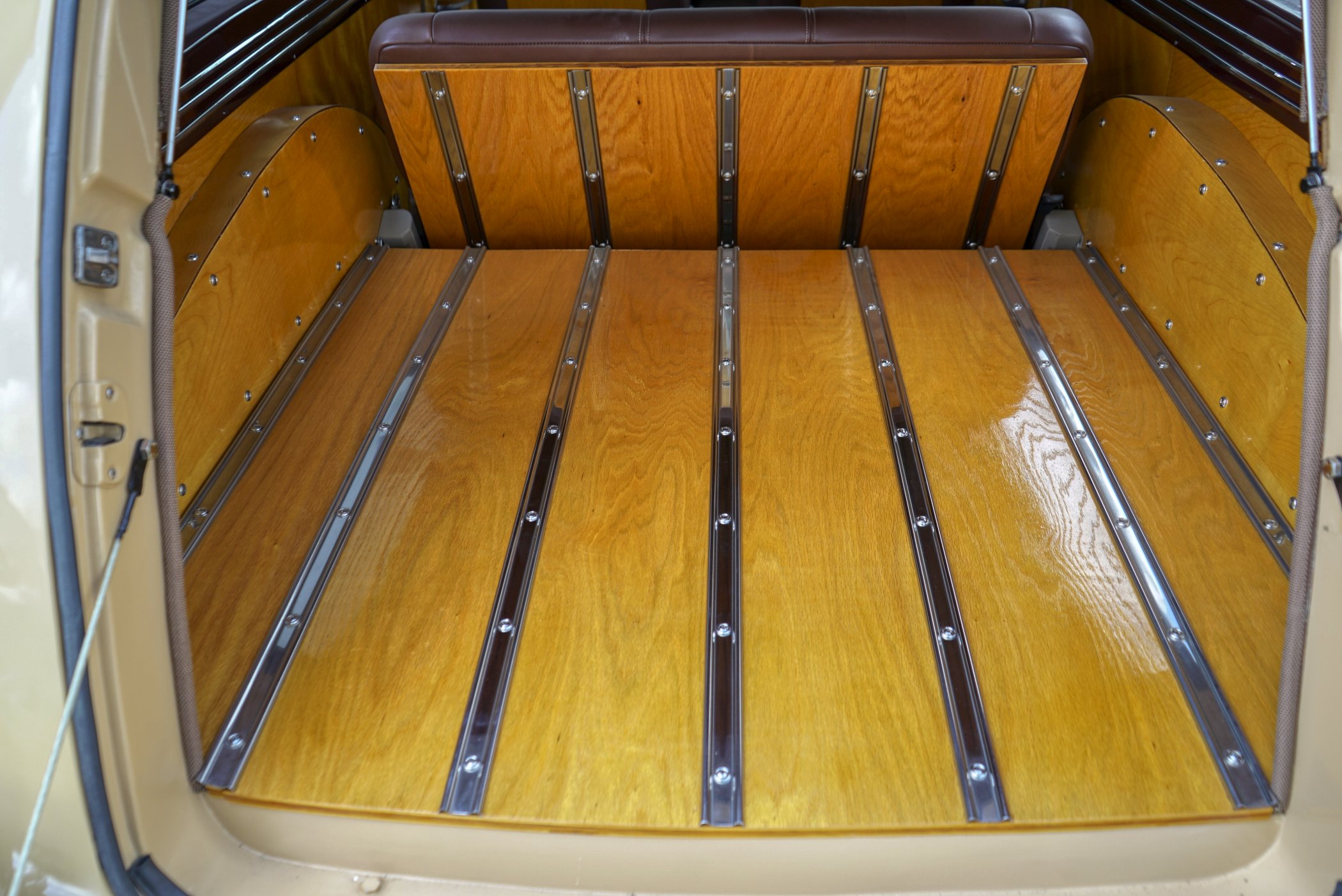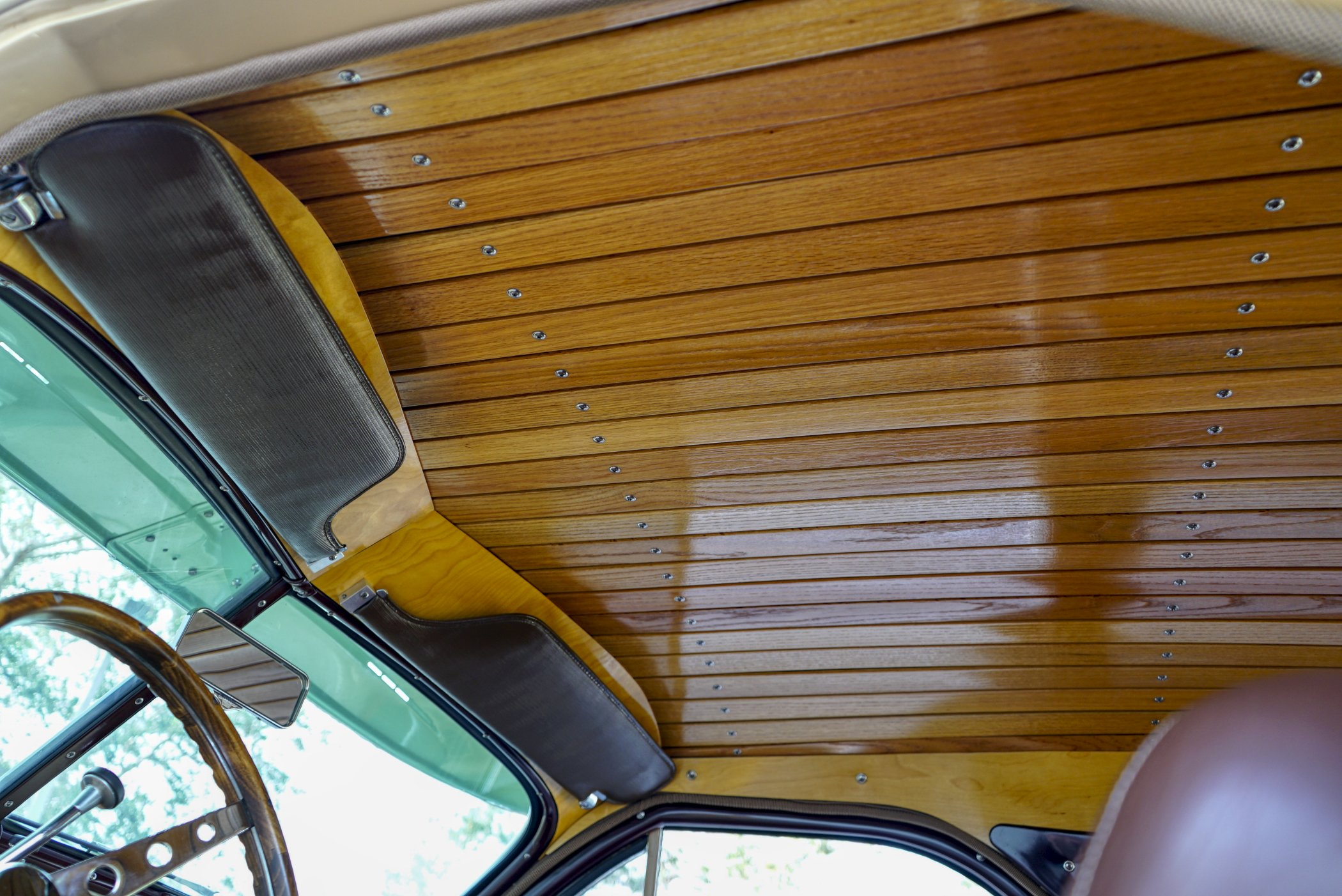 Equipped with period chrome trimmed sun visor and long and sleek metal and chrome 1940’s styled triple chrome accented rear side windows. Measuring 18′ 10 1/2″ with well crafted full wood interior of ash paneling throughout and wood slatted headliner. Precision leather crafted front bucket seats and a fold down comfortable leather crafted stitched rear seat folding down to continue the wood floor theme from rear door to front seats. Powered by a newer venerable Cadillac 429 V-8matted to a 4-speed automatic transmission riding on a comfortable Fleetwood suspension riding on 16″ wheels with dual system power disc braking to the front. Fully equipped with power steering, power breaks, and Vintage Air and Heating.