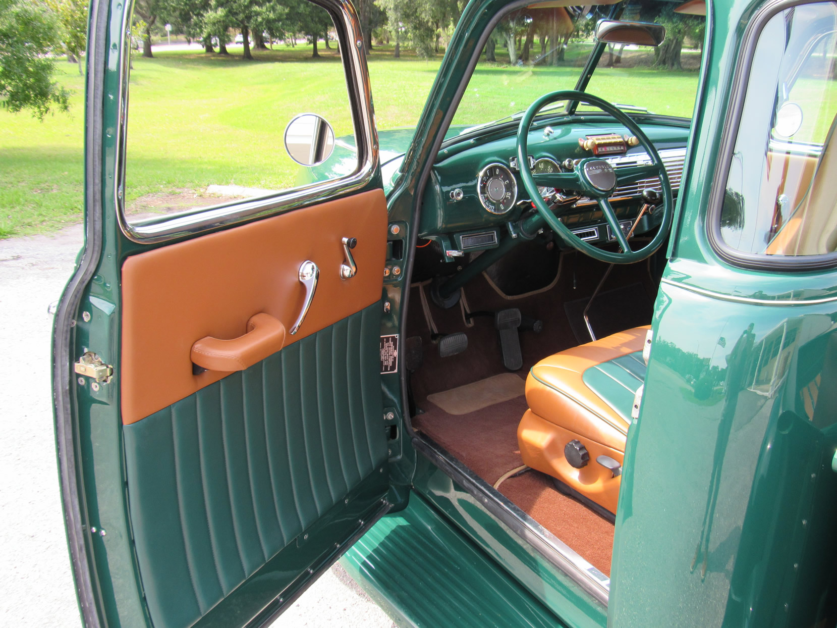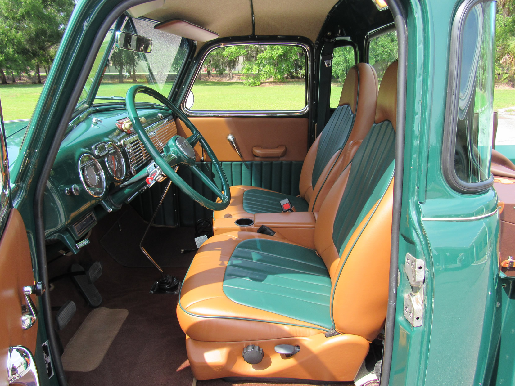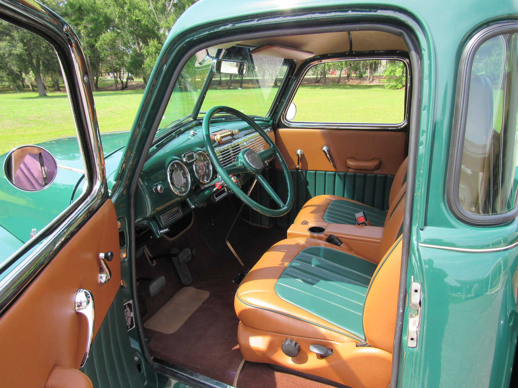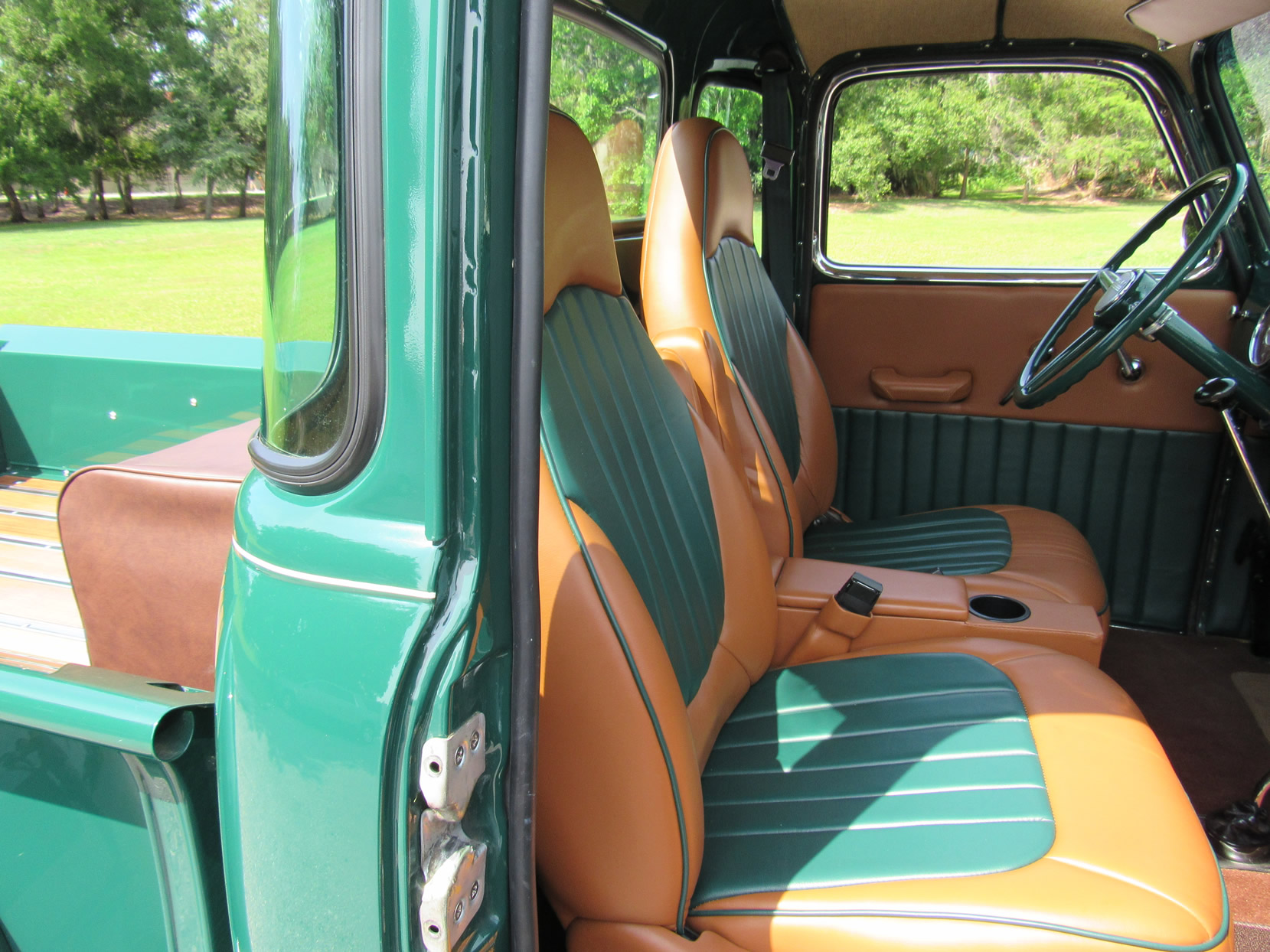 This 1948 5-window truck is a high-quality, frame-0ff restoration with upgrades in power and comfort and has been lowered 2”. It is powered by the 261ci 6-cylinder engine with a Fenton 2-carb intake and a Fenton split exhaust manifold plus a Saginaw 4-speed transmission. This truck also features power front disc brakes. The dark green paint with a small cream pin stripe around the belt line makes for an outstanding look. Moving to the bed you will find a highly polished mahogany wood floor with polished stainless divider strips. The bed also features a super nice leather storage trunk with a cover. The interior is breath taking with high quality green and dark tan high back bucket seats from a Ford Expedition with a console, cupholder and fold down inner arm rests. Interior features also includes professionally installed modern 134a air conditioning and heater unit, radio and 3-point seat belts. This great example has been converted to a 12-volt electrical system. It comes with extensive photos of the restoration and has just 2,500 miles on it since restoration was completed in 2015. Jump in this truck and go have hours of driving fun.