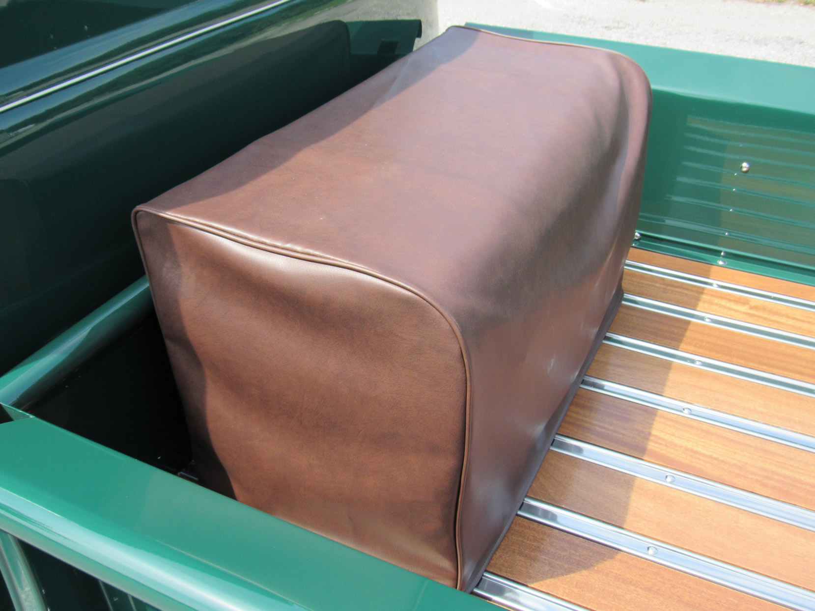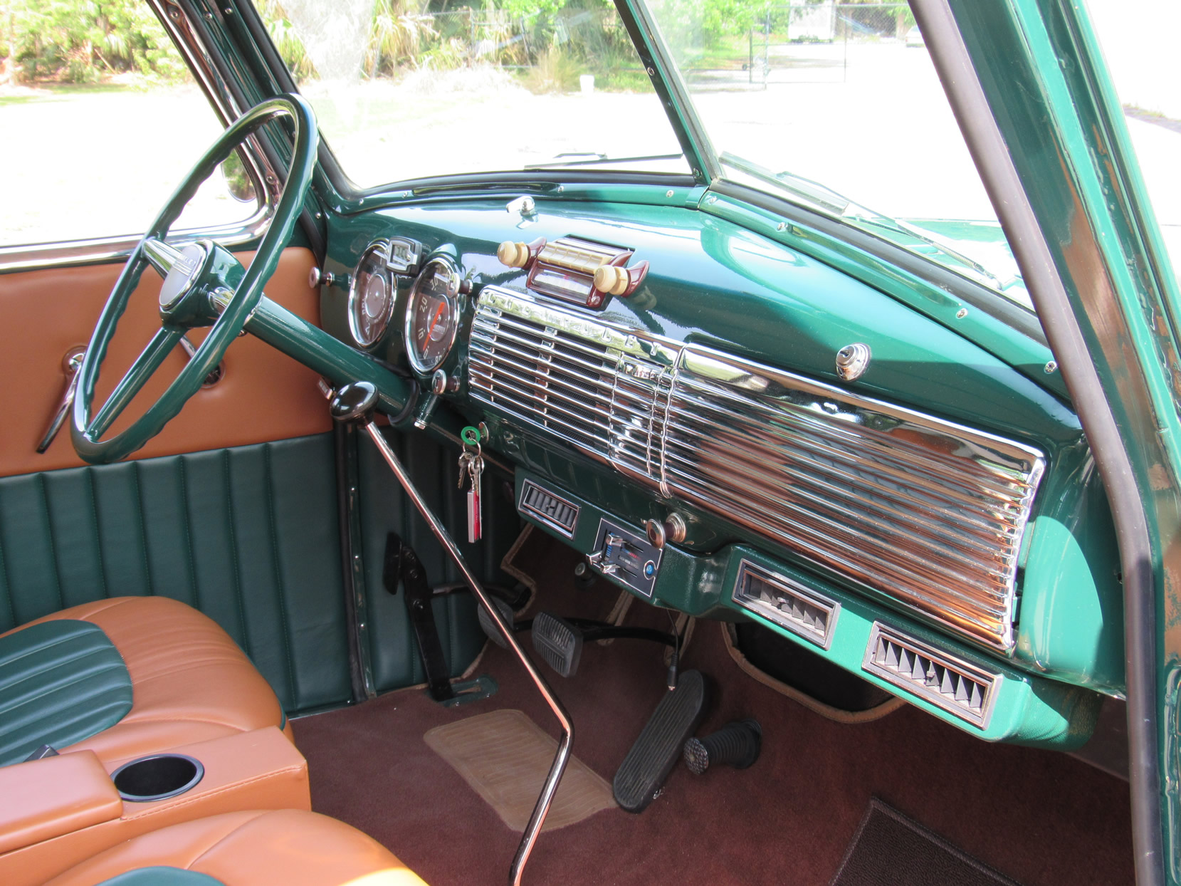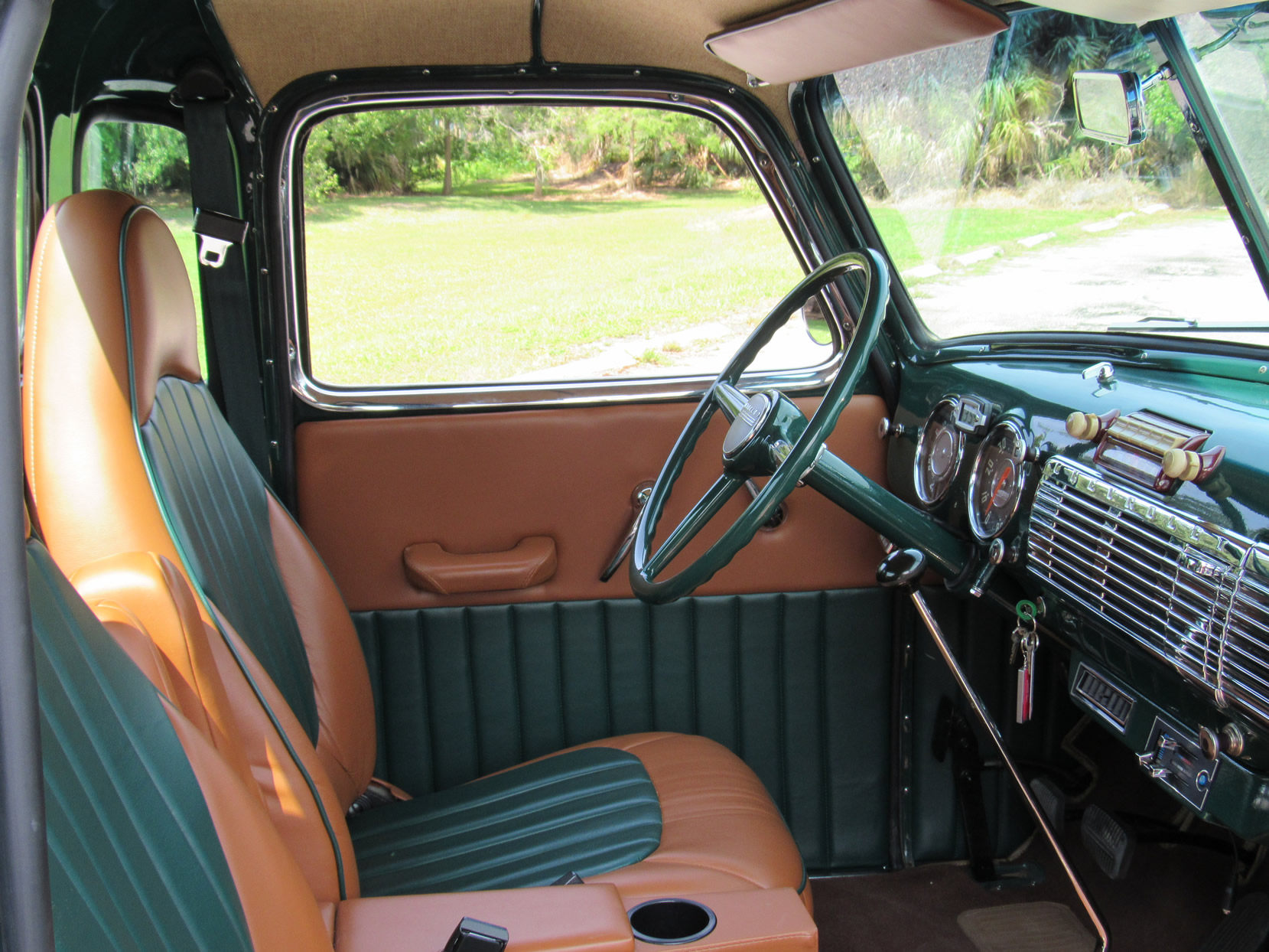This 1948 5-window truck is a high-quality, frame-0ff restoration with upgrades in power and comfort and has been lowered 2”. It is powered by the 261ci 6-cylinder engine with a Fenton 2-carb intake and a Fenton split exhaust manifold plus a Saginaw 4-speed transmission. This truck also features power front disc brakes. The dark green paint with a small cream pin stripe around the belt line makes for an outstanding look. Moving to the bed you will find a highly polished mahogany wood floor with polished stainless divider strips. The bed also features a super nice leather storage trunk with a cover. The interior is breath taking with high quality green and dark tan high back bucket seats from a Ford Expedition with a console, cupholder and fold down inner arm rests. Interior features also includes professionally installed modern 134a air conditioning and heater unit, radio and 3-point seat belts. This great example has been converted to a 12-volt electrical system. It comes with extensive photos of the restoration and has just 2,500 miles on it since restoration was completed in 2015. Jump in this truck and go have hours of driving fun.