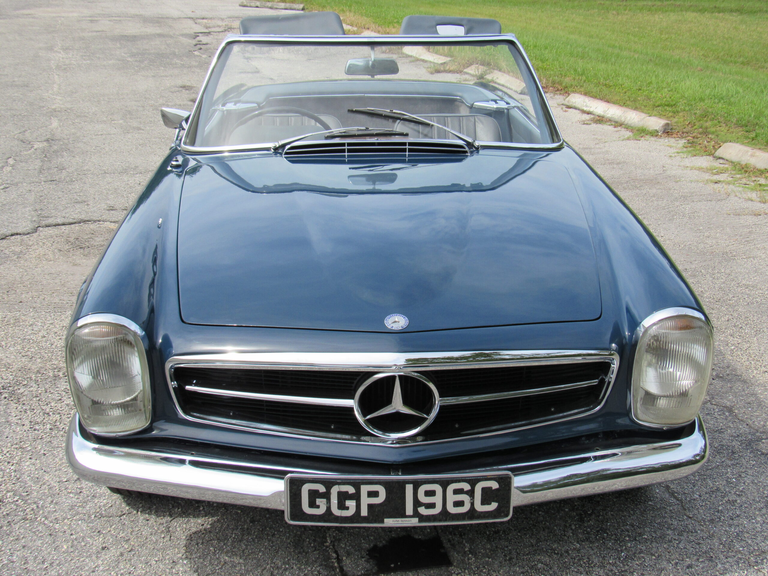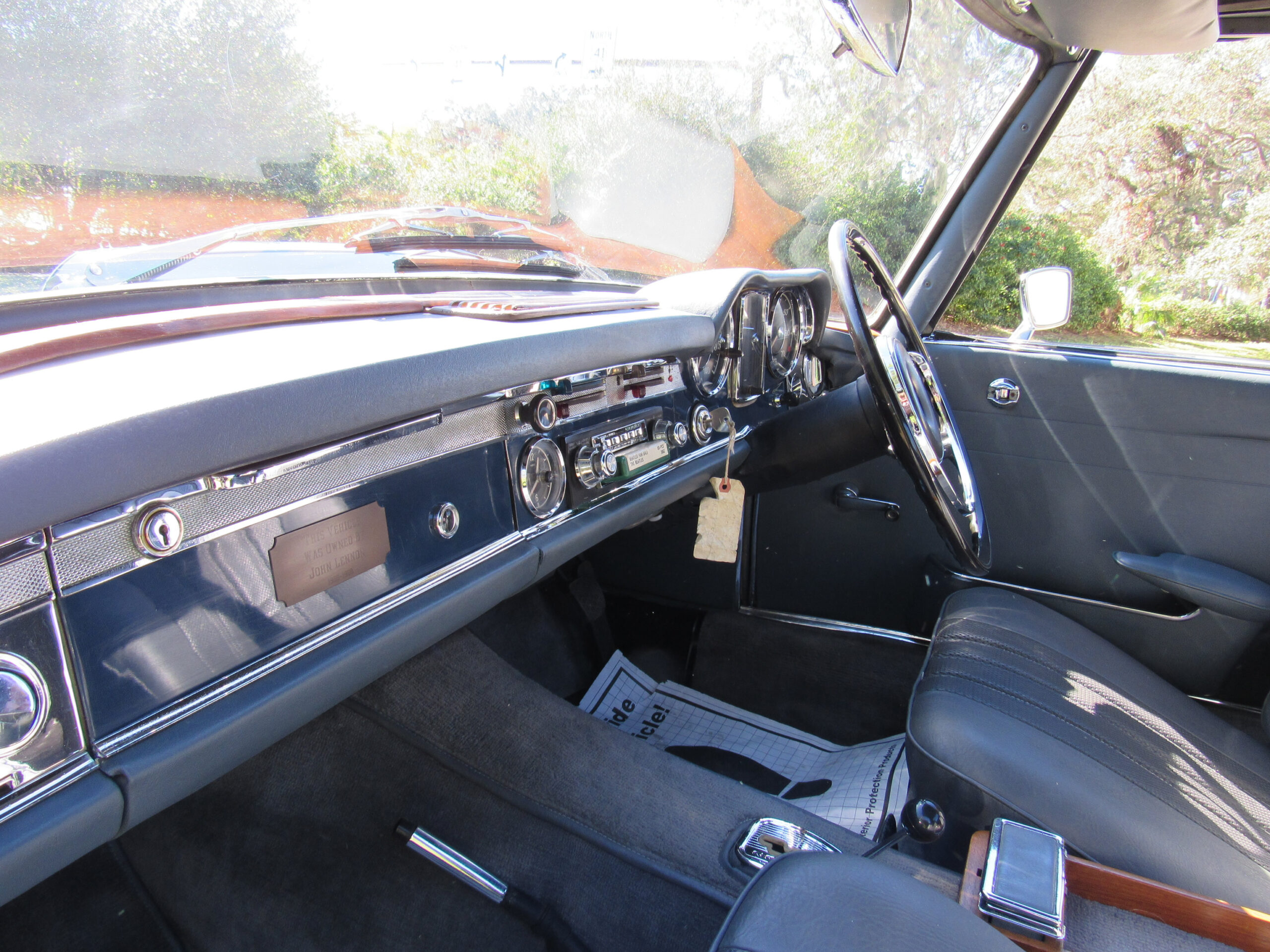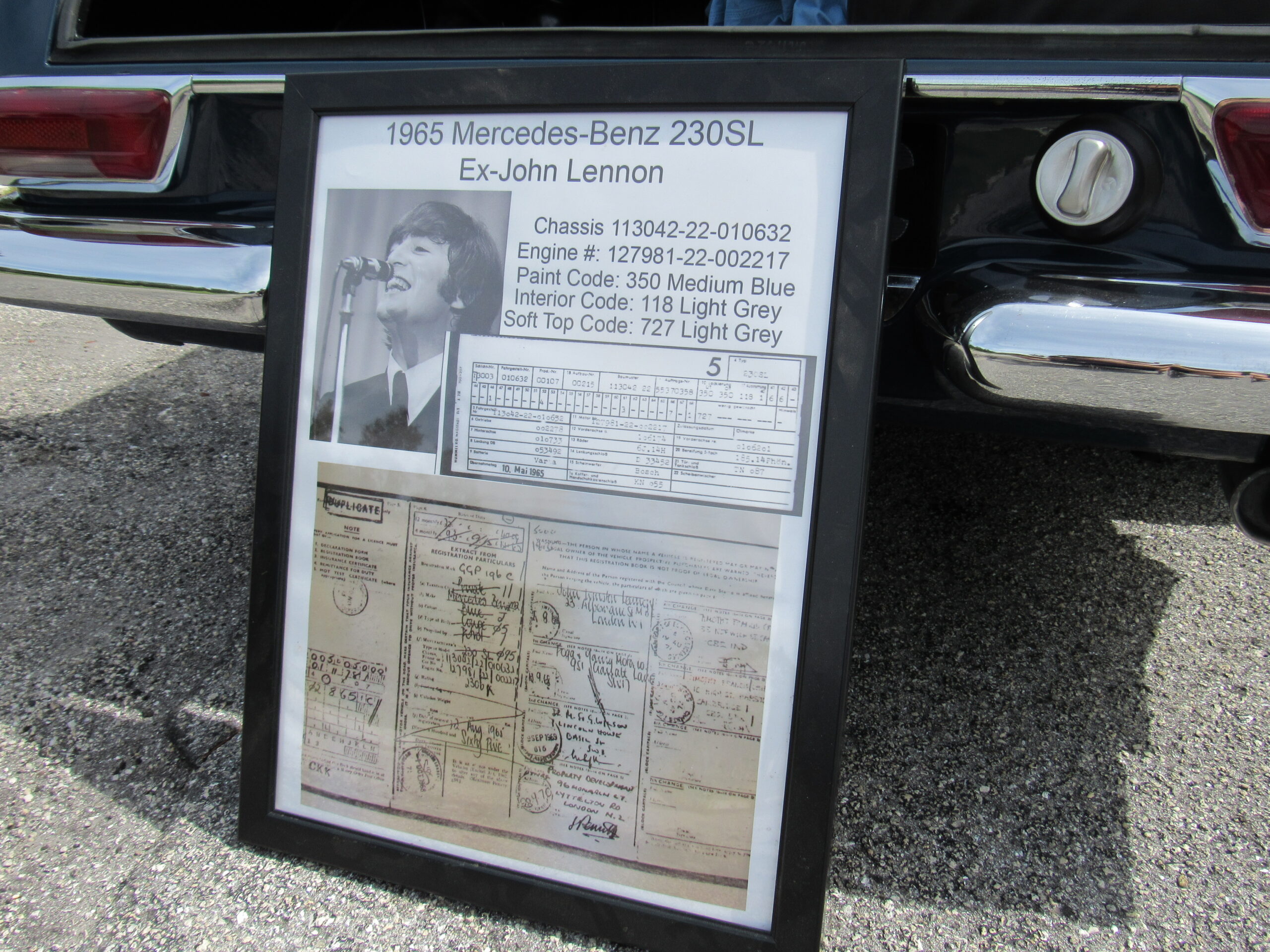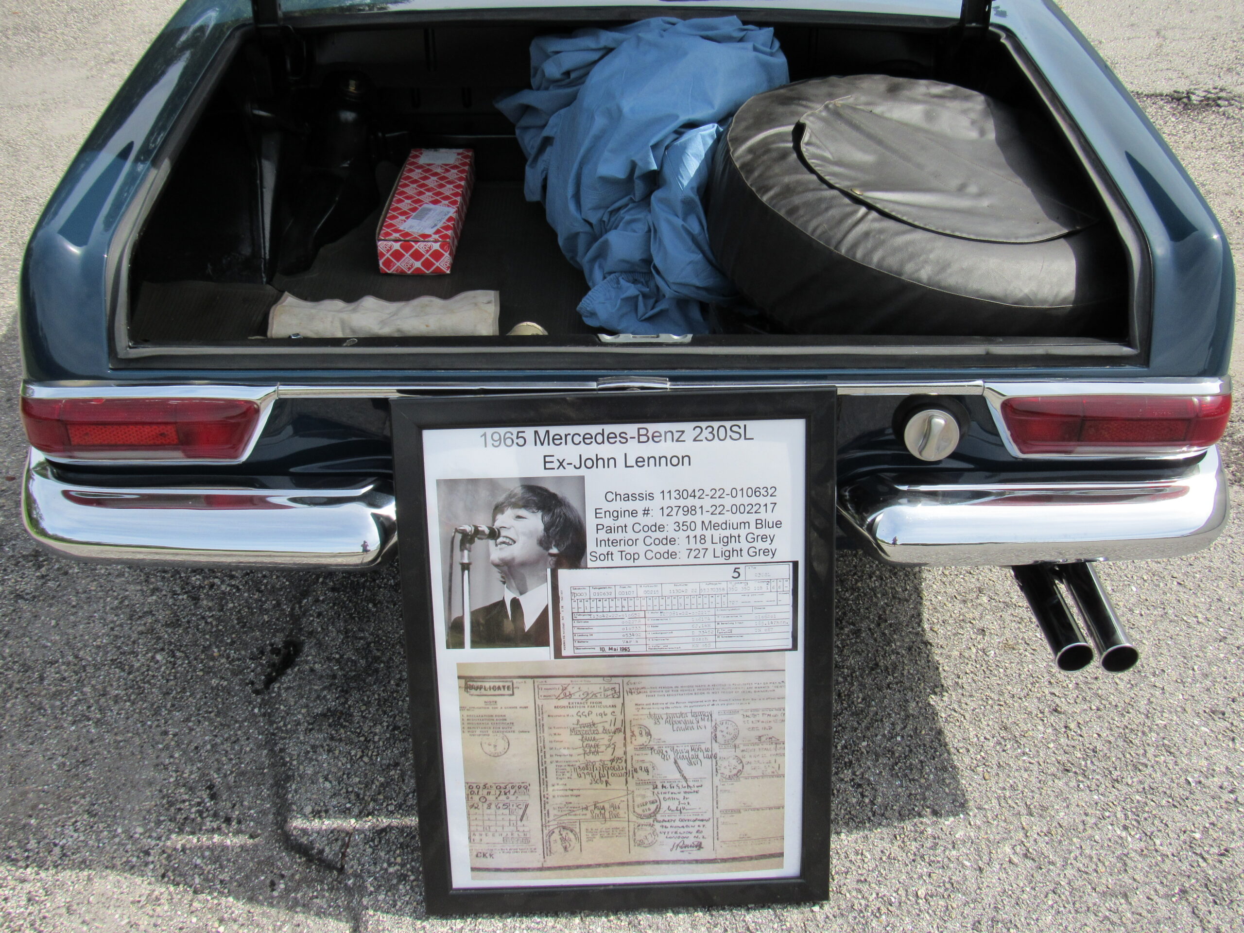 As offered, the car has been expertly reviewed and it is confirmed to retain the engine, chassis plate, transmission, and rear differential numbers matching those of the factory Data Card and it is confirmed as having been delivered new in its medium blue exterior color with grey interior, a grey soft top, and factory hardtop. Copies from the original logbook documents list John Winston Lennon, M.B.E. as the vehicle’s owner. The M.B.E. was the Queen’s Honorary Award and it was presented to The Beatles at Buckingham Palace in 1965. The address of 23 Albermarle, London was the mailing address for The Beatles, prior to their relocation to Savile Row under their Apple Records label name. The Mercedes is believed to have been sold by Lennon to a private couple in the Newmarket area and then to Mr. Howard Wise. It would then find its way to Peter Jarvis, the noted car dealer in Kent, who spotted the vehicle in the current museum display some time ago and recalled selling it to a gentleman in Cocoa Beach, Florida in the mid-1980s. Subsequently, the SL was sold to one Mr. Barnett in California who would later offer the car with it being acquired in 1999 by the current Florida museum owner.
