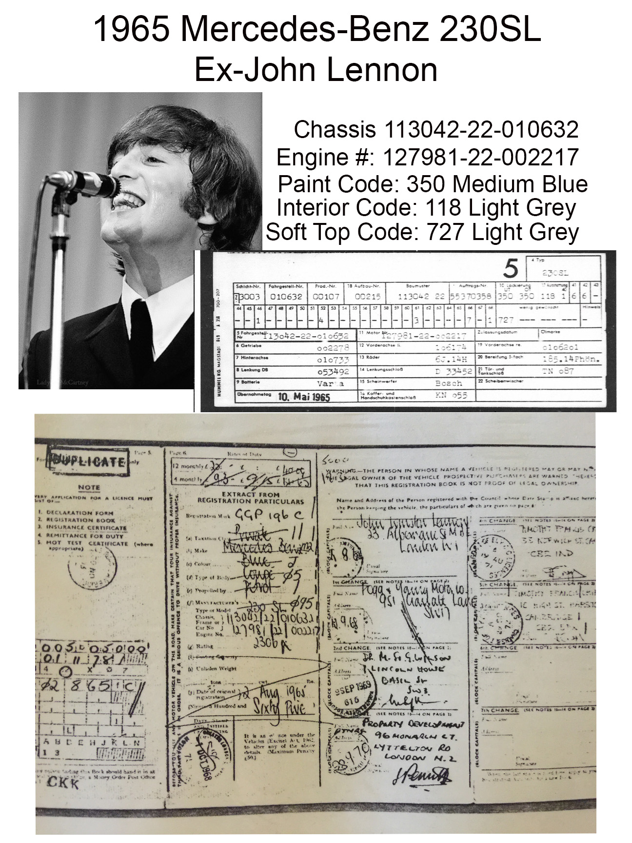 CHASSIS NO: 11304222010632 – Documentation includes a copy of the original UK registration bearing John Lennons iconic signature, photo of the car sitting in front of John Lennon’s Kenwood Home in Weybridge, UK, a photo of Cynthia Lennon with the car, photo of the car at Abbey Road Studios with Ringo in the foreground, and photo by Pattie Boyd (George Harrison’s wife) of George Harrison on a motorbike with the 230SL in be foreground, and other notable memorabilia, Specially ordered by John Lennon RHD with automatic transmission, Offered from long-term museum ownership in Florida, Confirmed matching numbers mechanicals per factory Data Card.